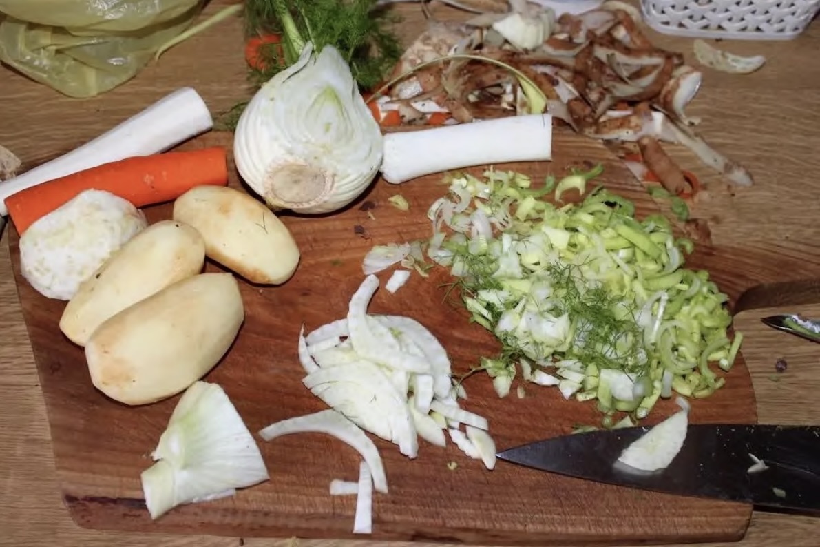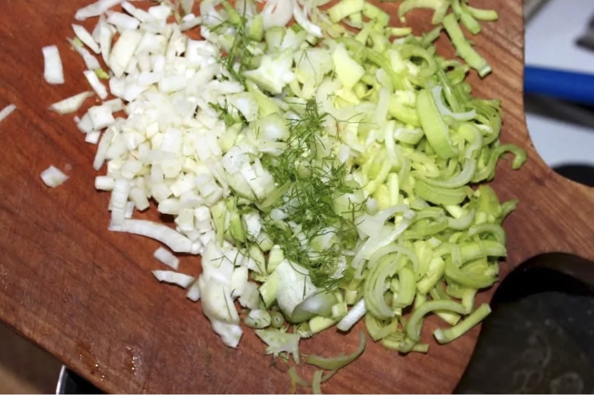 Dodanie kaszy i warzyw: Do wywaru dodaj pokrojonego pora, pokrojony koper włoski, pokrojone w kostkę ziemniaki, starte marchewkę i pietruszkę oraz przepłukaną kaszę jęczmienną. Gotuj przez 10 do 15 minut.