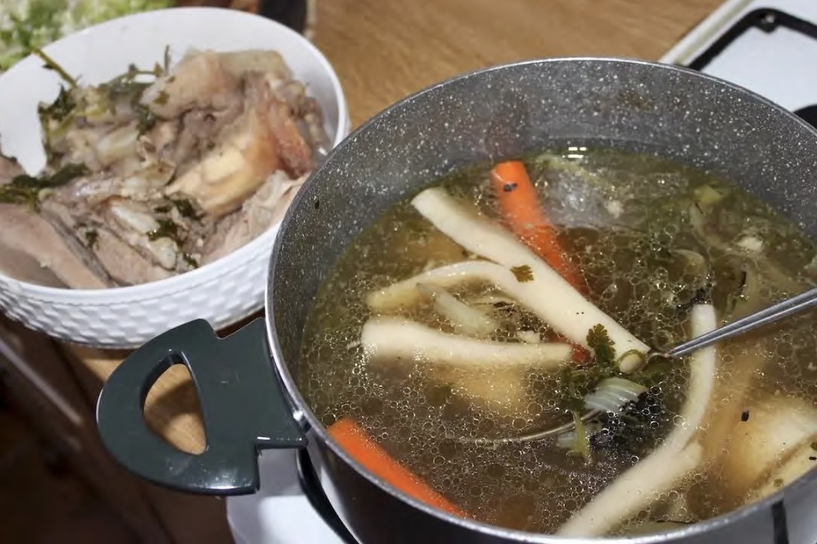 Cedzenie i mięso: Wyjmij mięso, ostudź, a następnie pokrój. Wywar przecedź, a następnie ponownie zagotuj.
