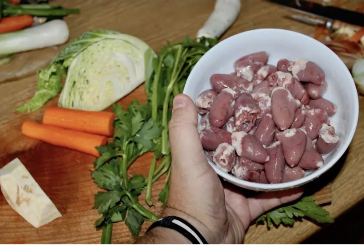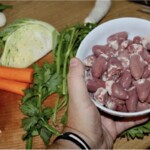 Gdy wywar jest gotowy, usuń warzywa z włoszczyzny (nie będą już potrzebne) i serca drobiowe (odłóż na bok).