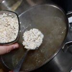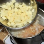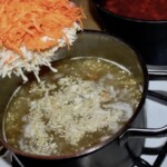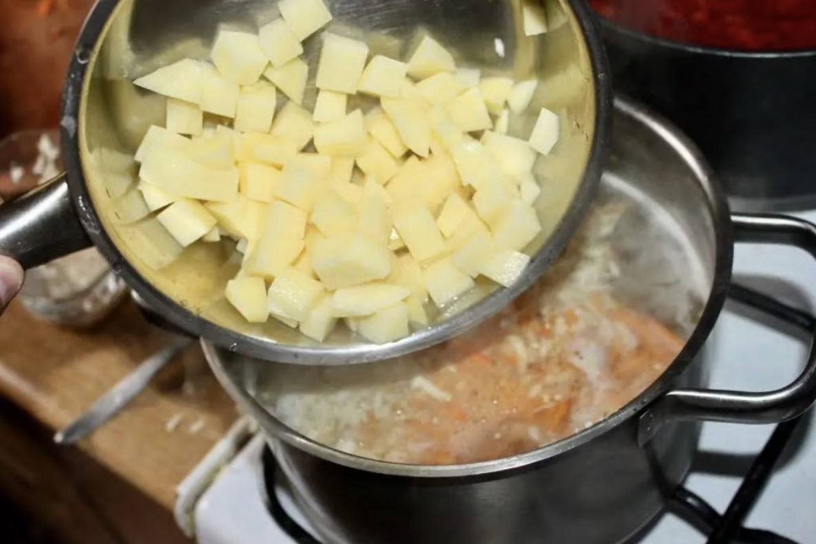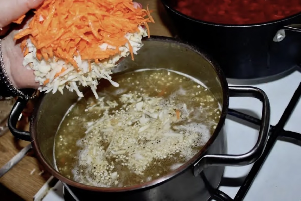Do wywaru wrzuć przepłukaną kaszę, starte warzywa oraz pokrojone w kostkę ziemniaki.
