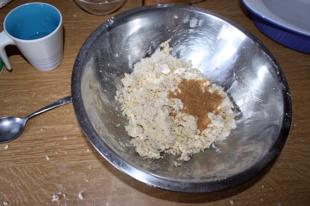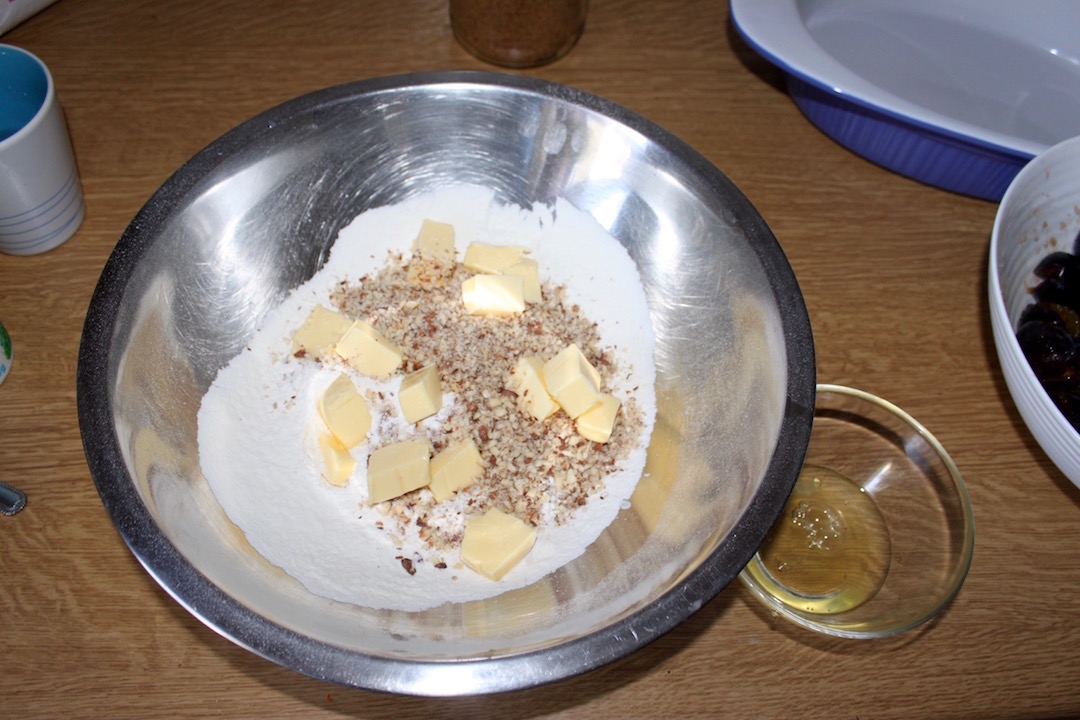 Mąkę przesiej do miski, dodaj proszek do pieczenia, orzechy oraz zimne masło pokrojone w kawałki.