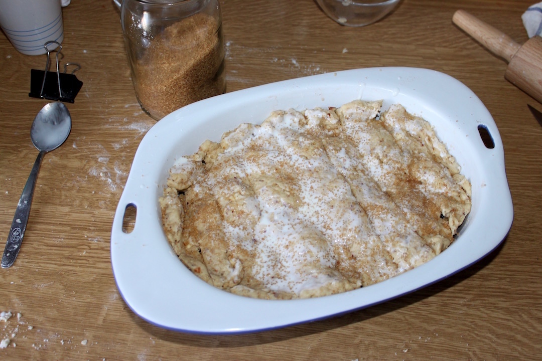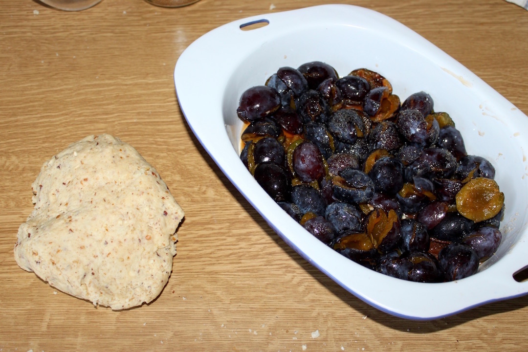 Ciasto lekko rozwałkuj lub uformuj rękami na grubość ok. 0,5 cm i połóż na śliwkach, delikatnie dociskając.