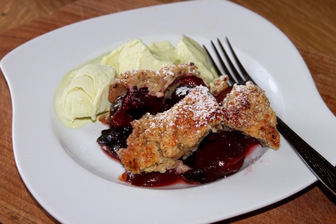 Kruszonka ze śliwkami najlepiej smakuje na ciepło, podany z gałką lodów pistacjowych. Można go również posypać cukrem pudrem.