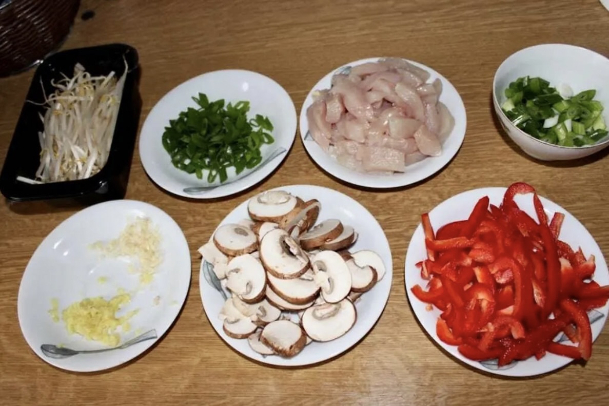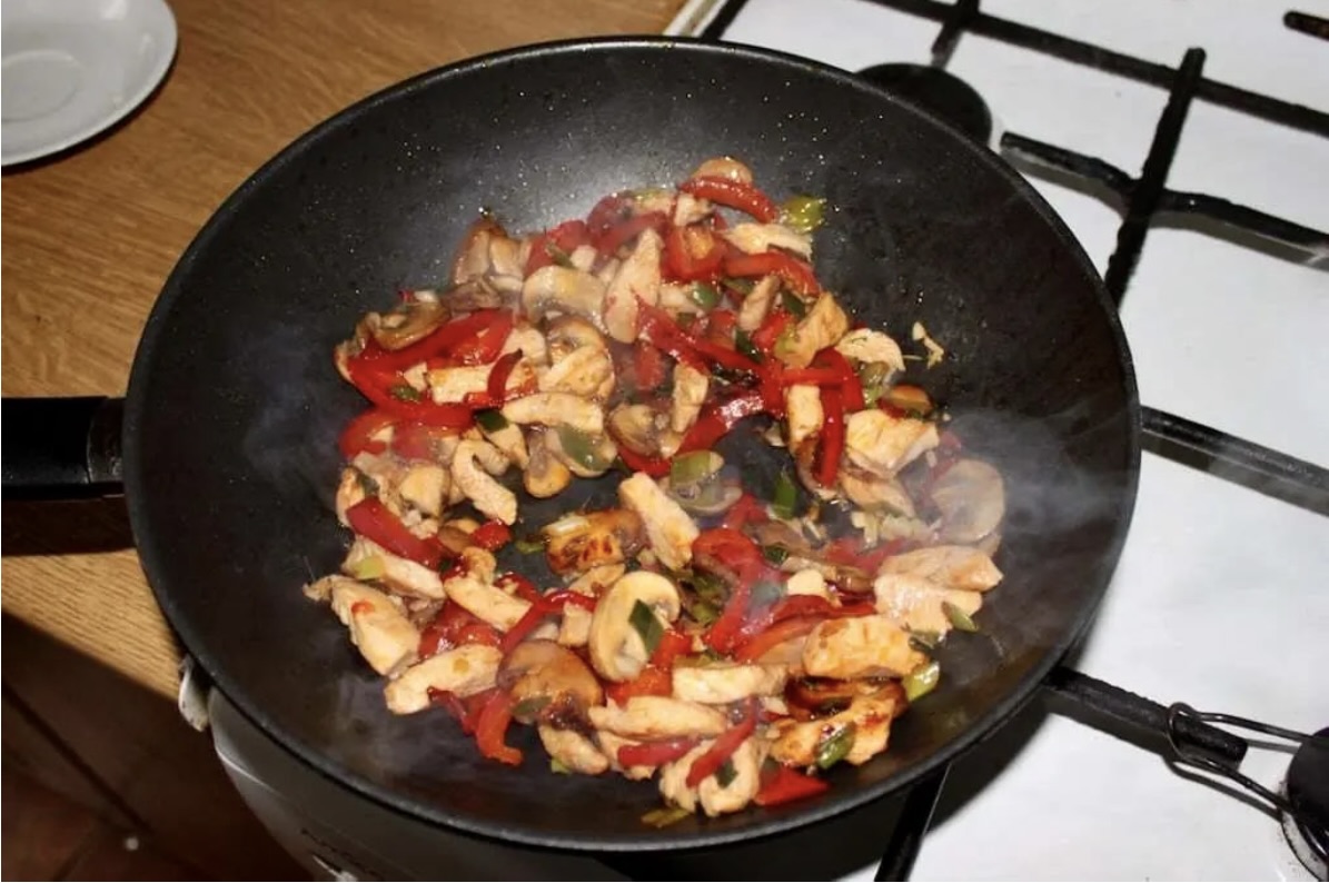 Do kurczaka dodaj paprykę, pieczarki oraz białe części dymki. Smaż przez kolejne 3 minuty, ciągle mieszając/podrzucając.