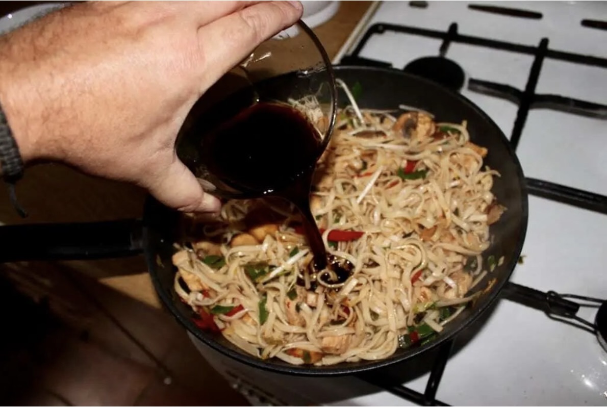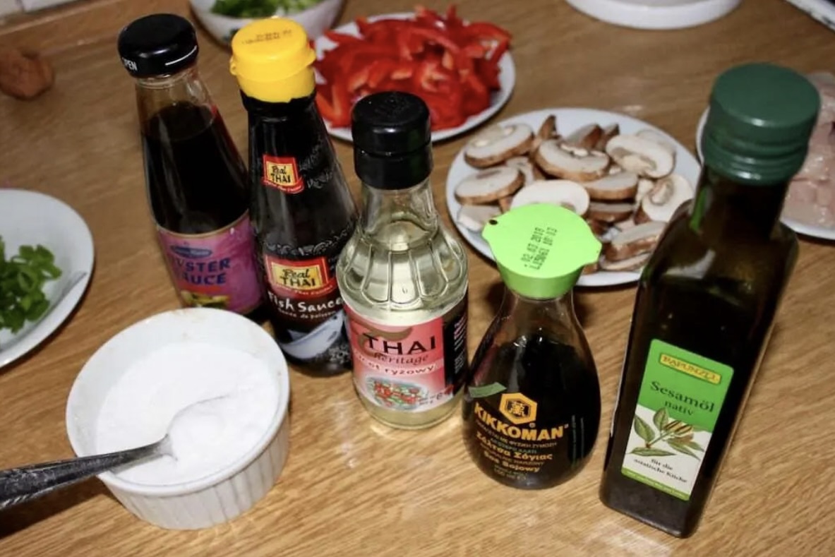 Sos: 2 łyżki sosu ostrygowego, 2 łyżki sosu sojowego, 2 łyżki octu ryżowego, 1 łyżka oleju sezamowego, 1 łyżka sosu rybnego, 1 łyżeczka cukru, 2-3 łyżki wody.