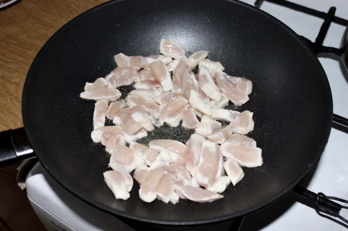 Mocno rozgrzej wok z 2 łyżkami oleju. Wrzuć kurczaka, a następnie smaż przez około 3 minuty na bardzo dużym ogniu, często podrzucając.