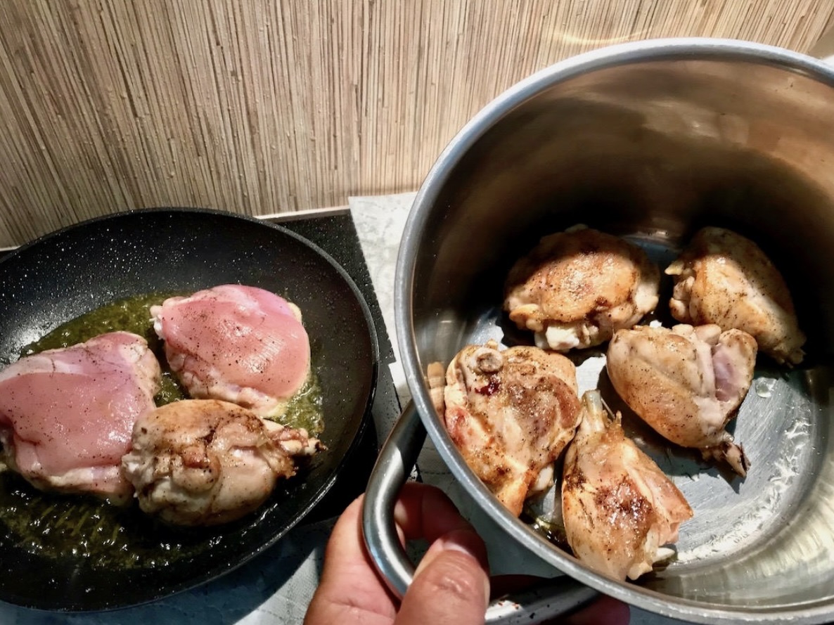 Smaż kurczaka na dość mocnym ogniu, aby ładnie się zarumienił. Jeśli musisz, smaż partiami, a usmażone mięso przekładaj do dużego garnka.