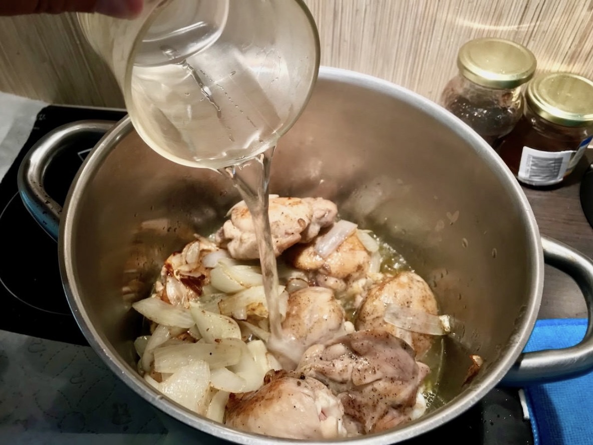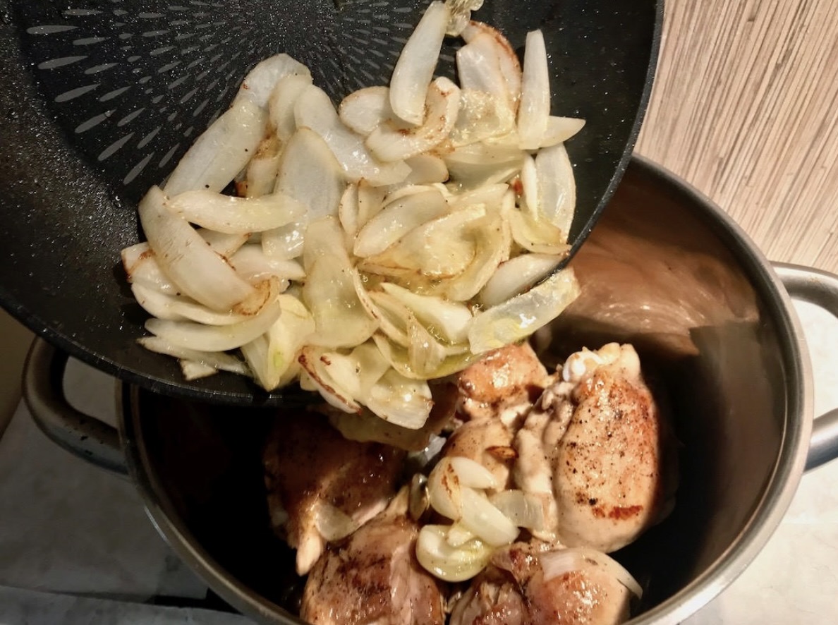 Wszystkie przesmażone kawałki kurczaka wraz z cebulą umieść w dużym garnku.