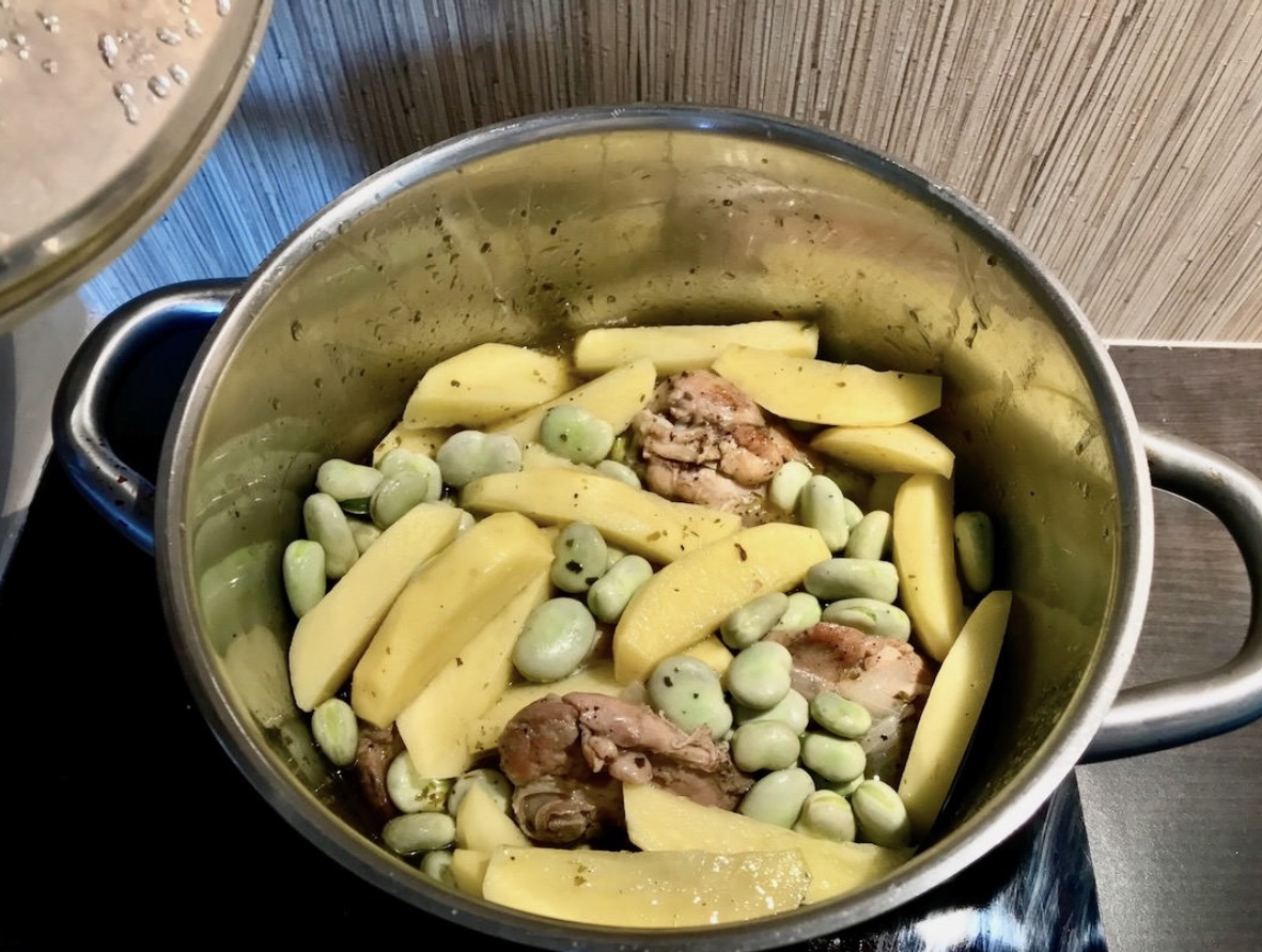 W trakcie duszenia kurczaka przygotuj i umyj bób, a ziemniaki obierz i pokrój w łódeczki.