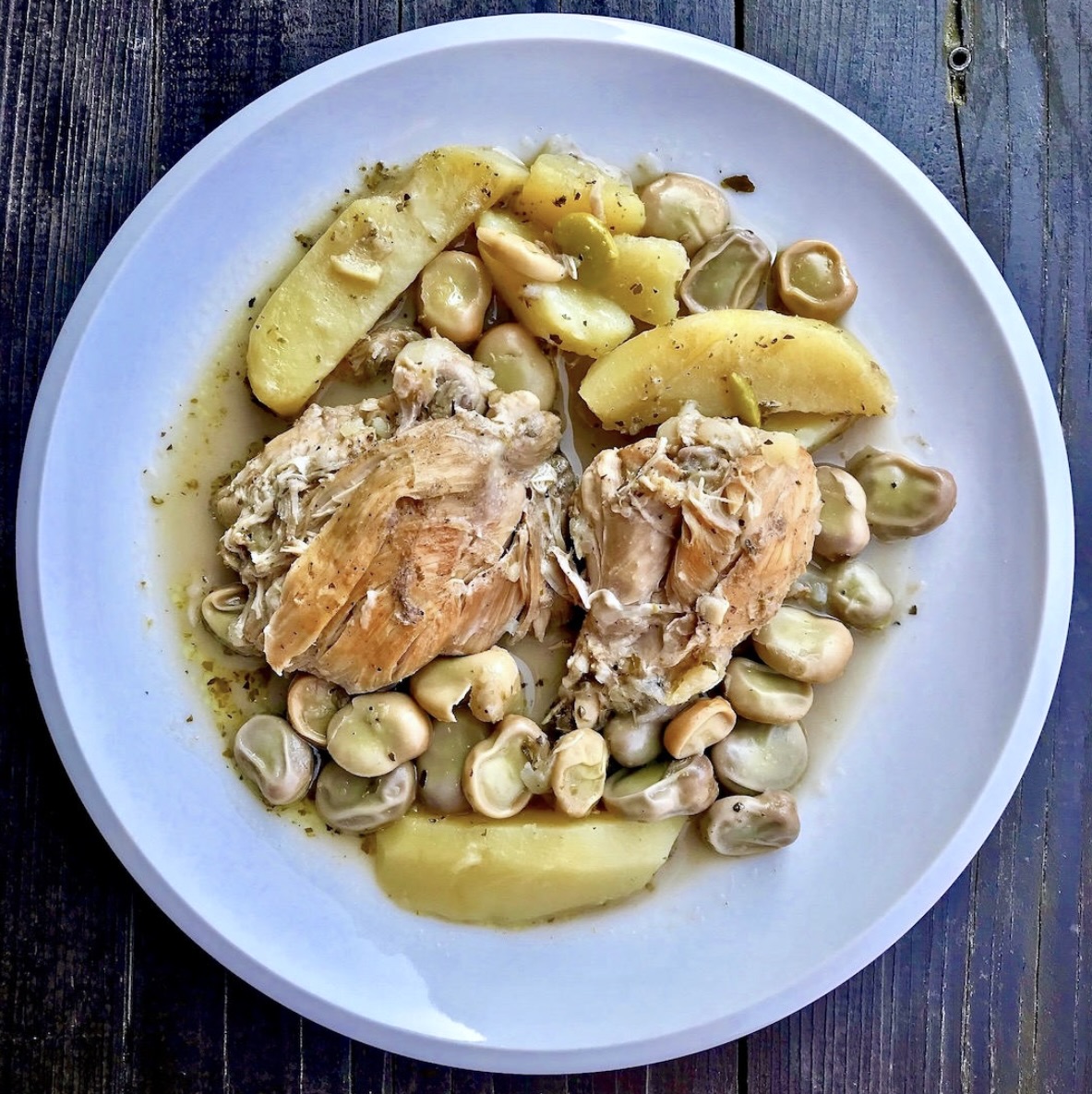 Kurczak duszony w sosie to kolejna odsłona smakowitego dania, którego przepis oparłem o sposób gotowania na Krecie. Sam przepis jest mojego autorstwa, a większość zapożyczeń dotyczy raczej „techniki” gotowania tego dania. Aby poprawić wygląd dania zarówno bób, jak i ziemniaki, które są tutaj dodatkami, można ugotować osobno. Wszystkie składniki połączyć wtedy należy na około 10 minut przed końcem przyrządzania dania. W tym przypadku danie zyska co prawda na wyglądzie, jednak wyraźnie straci na smaku. Zdecyduj, co jest dla Ciebie ważniejsze.