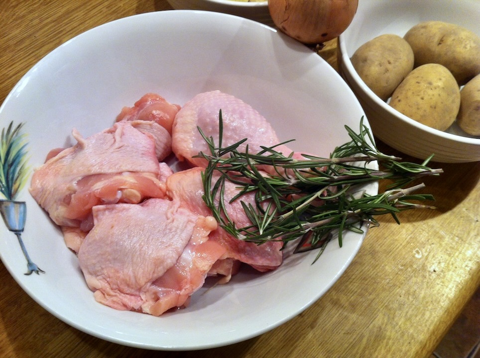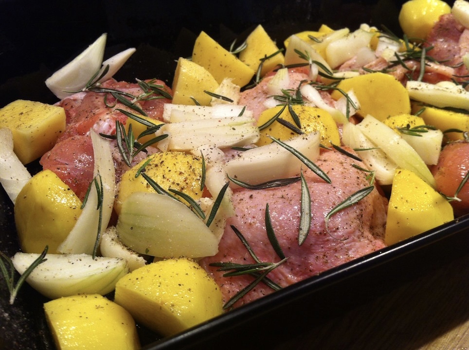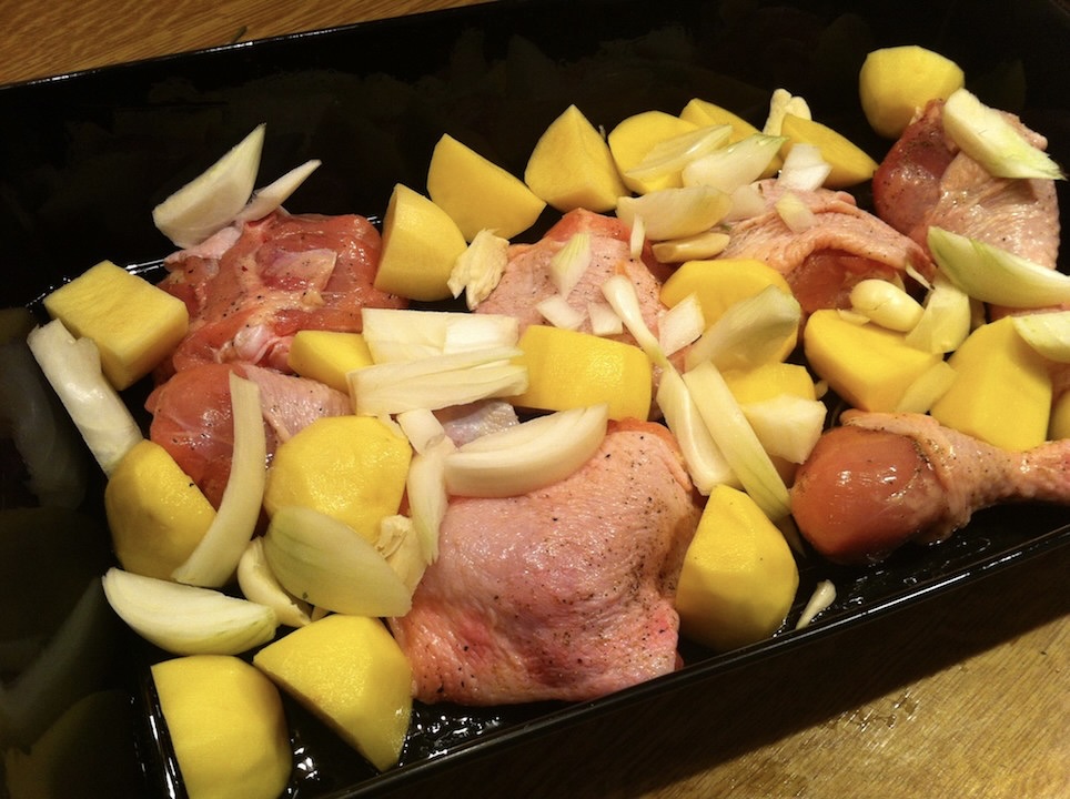 W naczyniu żaroodpornym lub brytfance ułóż kawałki kurczaka, a między nimi rozmieść ziemniaki, cebulę i czosnek.