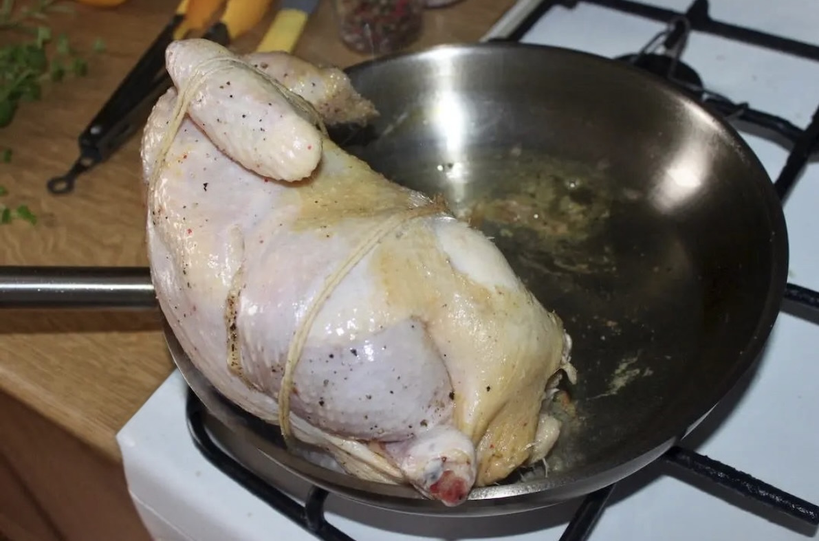 Przygotowanie mięsa: Kurczaka umyj, osusz, posól i popieprz. Zwiąż go sznurkiem kuchennym, a następnie wmasuj w niego niewielką ilość oliwy.