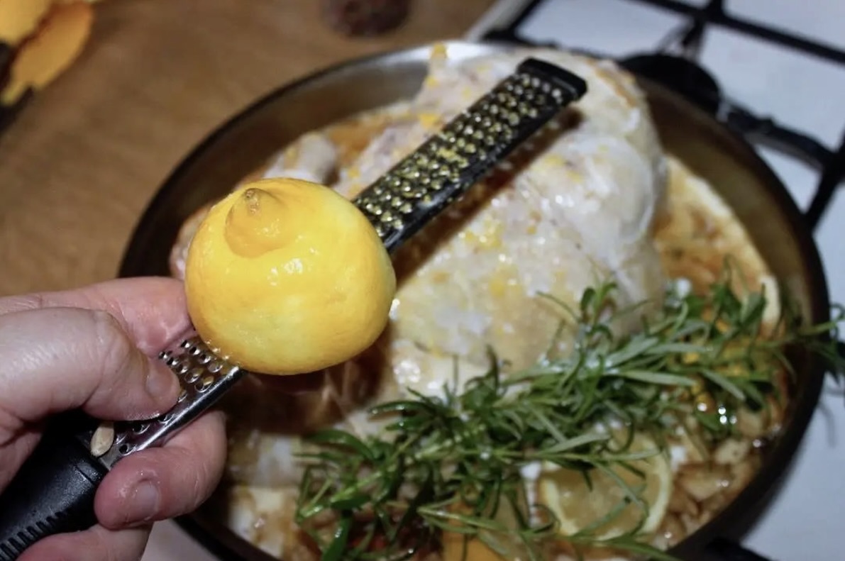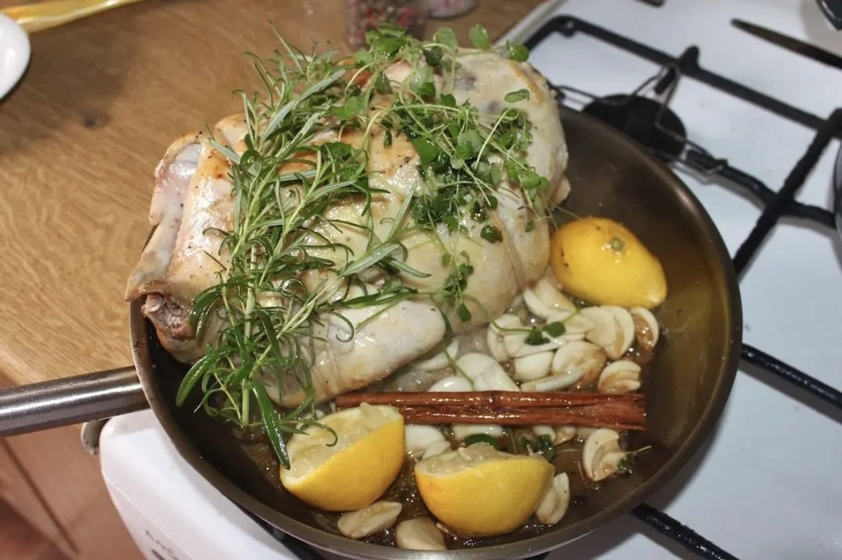 Łączenie smaków: Do przesmażonego kurczaka dorzuć obrane ząbki czosnku, świeże zioła (oregano, rozmaryn) oraz laskę cynamonu. Wyciśnij sok z dwóch cytryn, a następnie wrzuć wyciśnięte połówki na patelnię. Smaż przez 2-3 minuty.