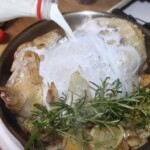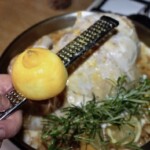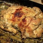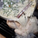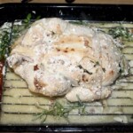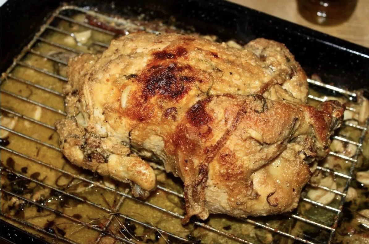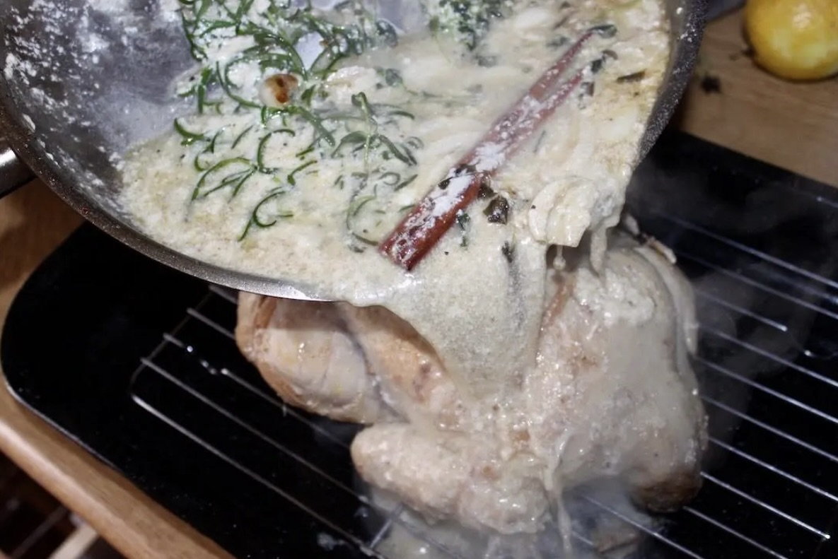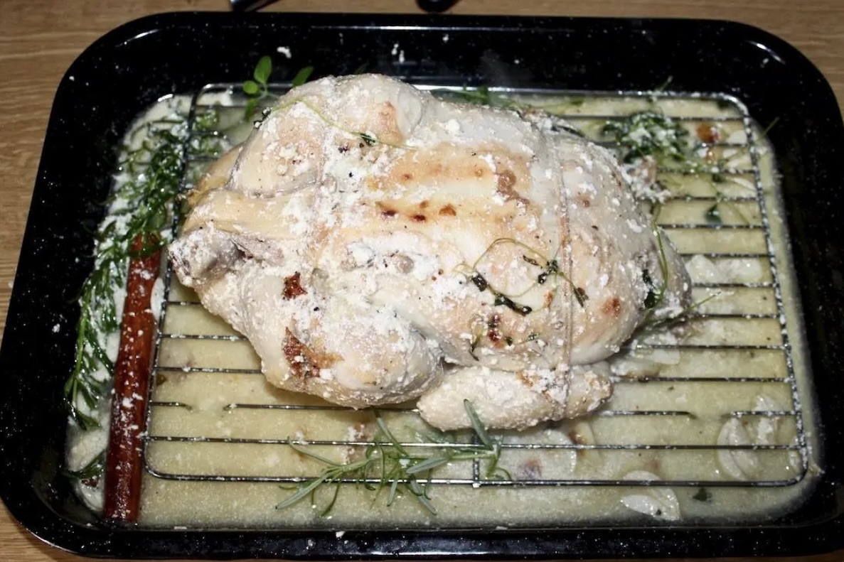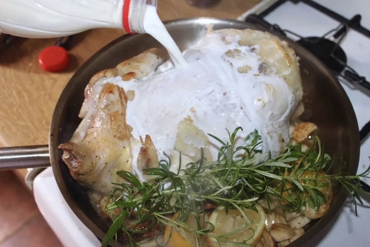 Kurczak pieczony w mleku z dodatkiem dużej ilości czosnku, cytryn oraz aromatycznych ziół i przypraw jest bodaj najdelikatniejszym kurczakiem, jakiego jadłem. Krótkie przesmażenie całego ptaka i pieczenie go w otulinie, gdzie odparowuje mleko daje niebywałe efekty. Choć brakuje mu chrupiącej skórki to jednak kurczak jest miękki, delikatny i wyraźnie mleczny w smaku. Aż się prosi, aby podać go z lejącym się puree ziemniaczanym, a całość skropić sosem powstałym podczas pieczenia ptaka. Poezja.
