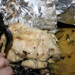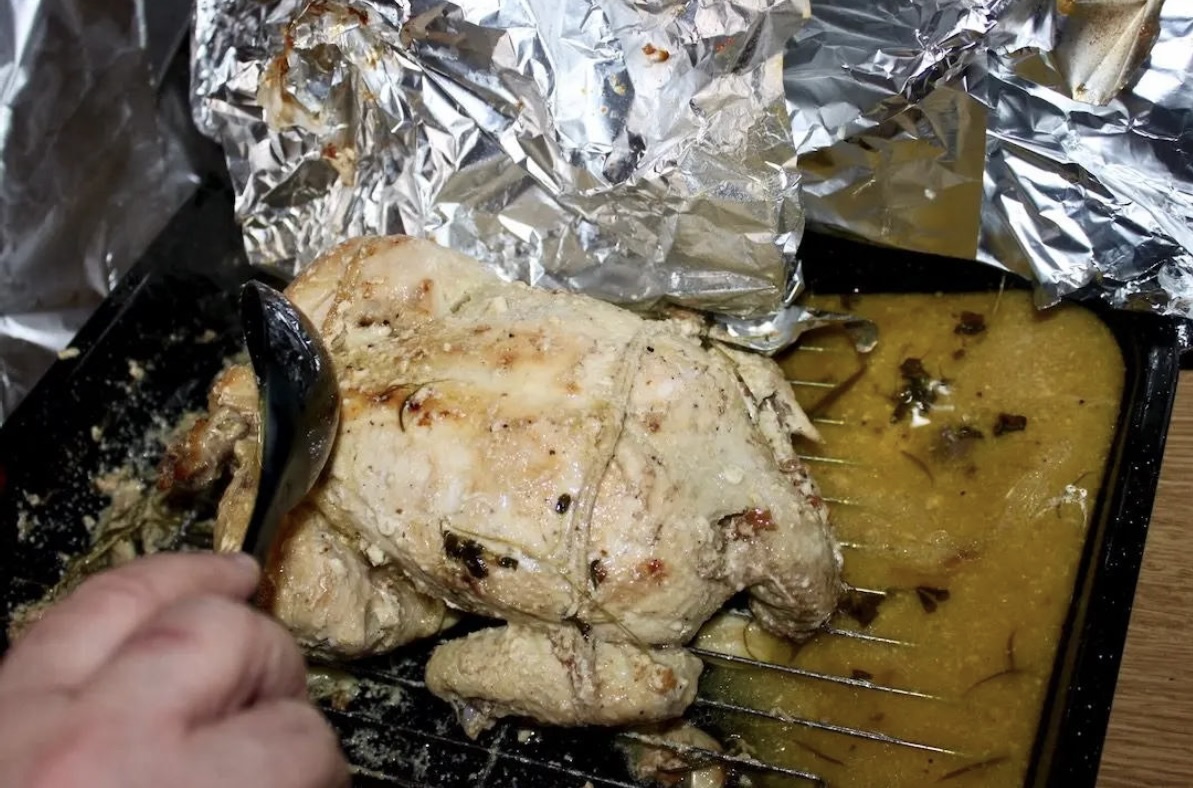 Pieczenie (etap 2): Po godzinie zdejmij folię, polej kurczaka sosem z dna naczynia i piecz bez przykrycia przez kolejne 30-40 minut, aż kurczak będzie miękki i rumiany.