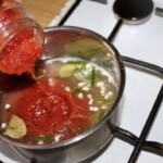 Marynatę z naczynia przelej do garnka, a następnie dodaj puszkę pomidorów (a jeszcze lepiej domowy sos pomidorowy). Gotuj przez około 15 minut, aż sos się nieco zredukuje. (Wskazówka: nie dosalaj sosu na tym etapie – szynka i oliwki są wystarczająco słone).