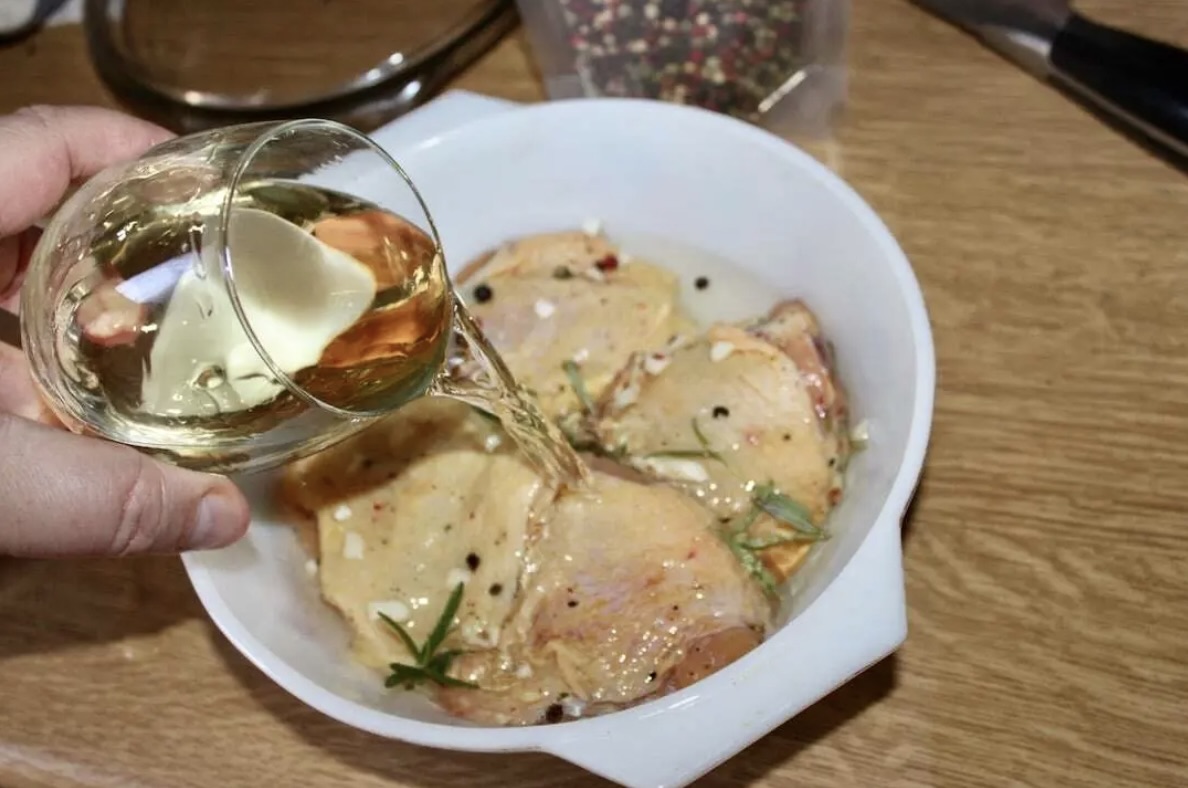 Zalej wszystko kieliszkiem białego wina, wymieszaj, a następnie odstaw do lodówki na minimum 1 godzinę.