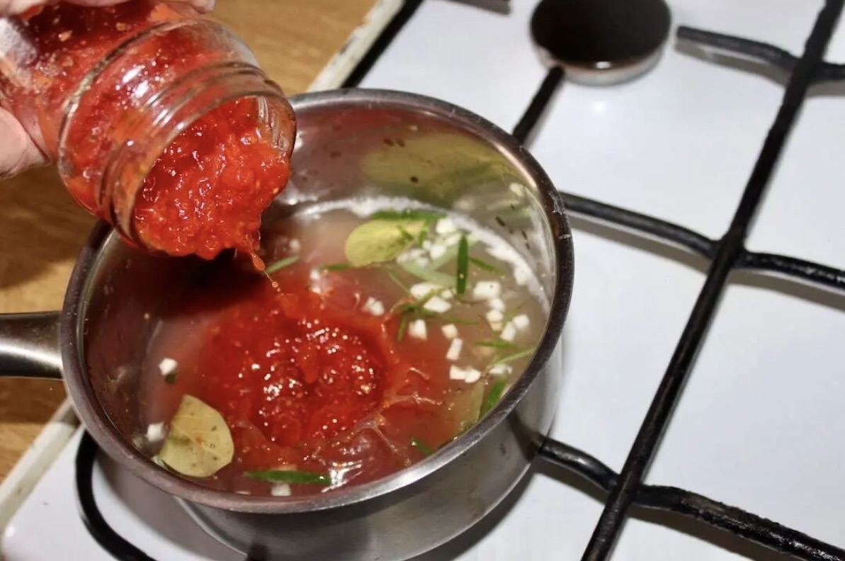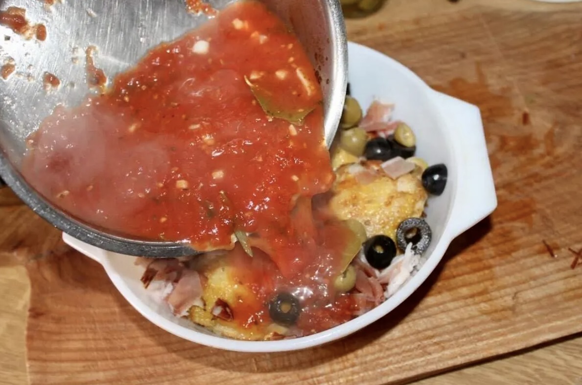Marynatę z naczynia przelej do garnka, a następnie dodaj puszkę pomidorów (a jeszcze lepiej domowy sos pomidorowy). Gotuj przez około 15 minut, aż sos się nieco zredukuje. (Wskazówka: nie dosalaj sosu na tym etapie – szynka i oliwki są wystarczająco słone).