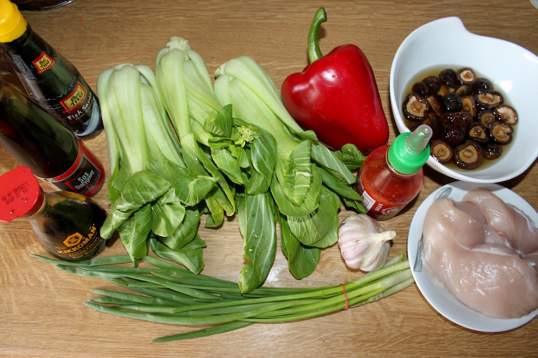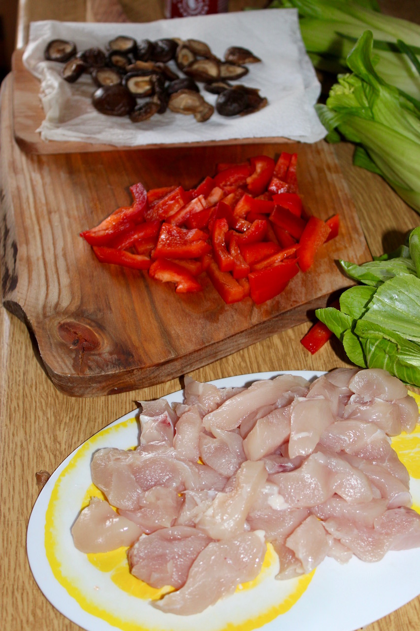 Warzywa: 3 małe kapusty pak choy (lub pekińska), 1 mała czerwona papryka (lub pół dużej), garść grzybów shiitake (namoczonych lub świeżych).