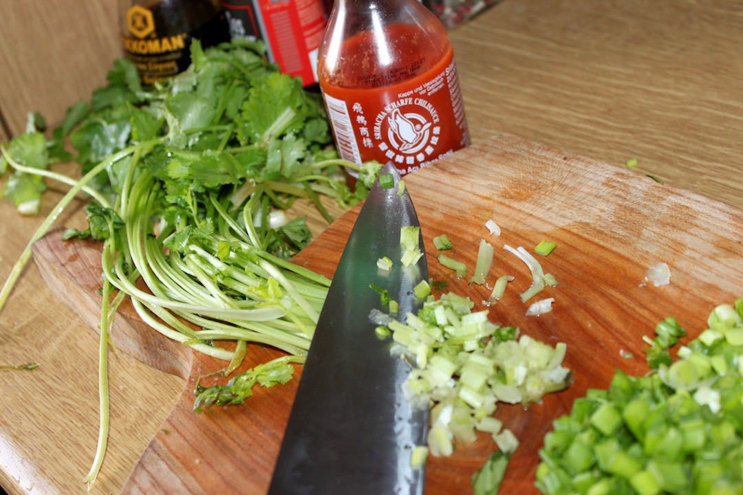 Z kolendry odkrój łodyżki i je posiekaj, liście zostaw do dekoracji.