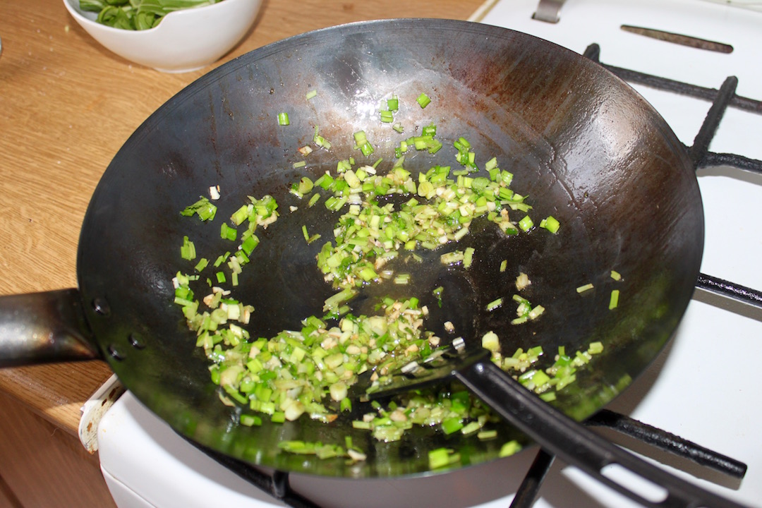 Na tę samą patelnię wlej 1-2 łyżki oleju, wrzuć białą dymkę, czosnek i łodyżki kolendry. Smaż 30 sekund, ciągle mieszając.