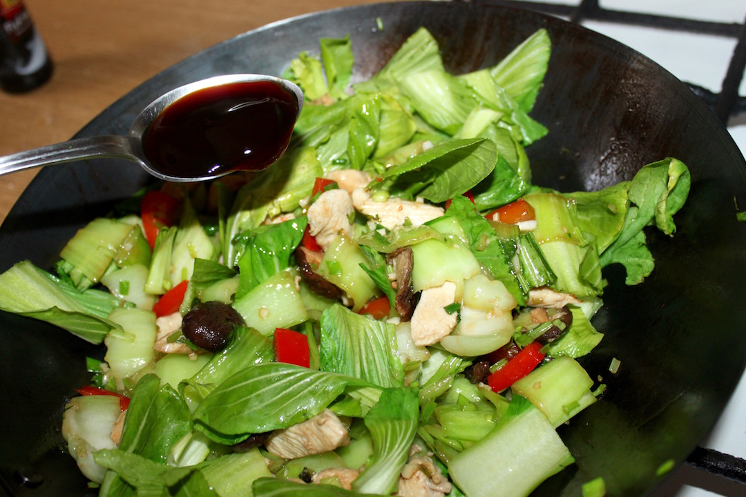 Wrzuć z powrotem podsmażonego kurczaka z warzywami oraz dodaj liście pak choy.