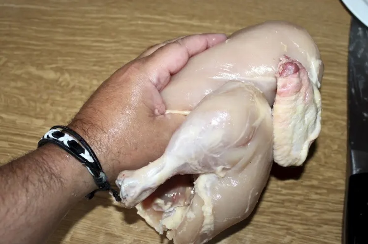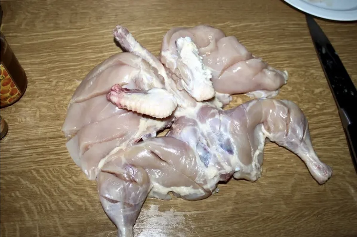 Rozetnij go wzdłuż klatki piersiowej i połóż wnętrzem do dołu. Mocno naciśnij na kręgosłup dłonią, aby go złamać – kurczak powinien stać się płaski.
