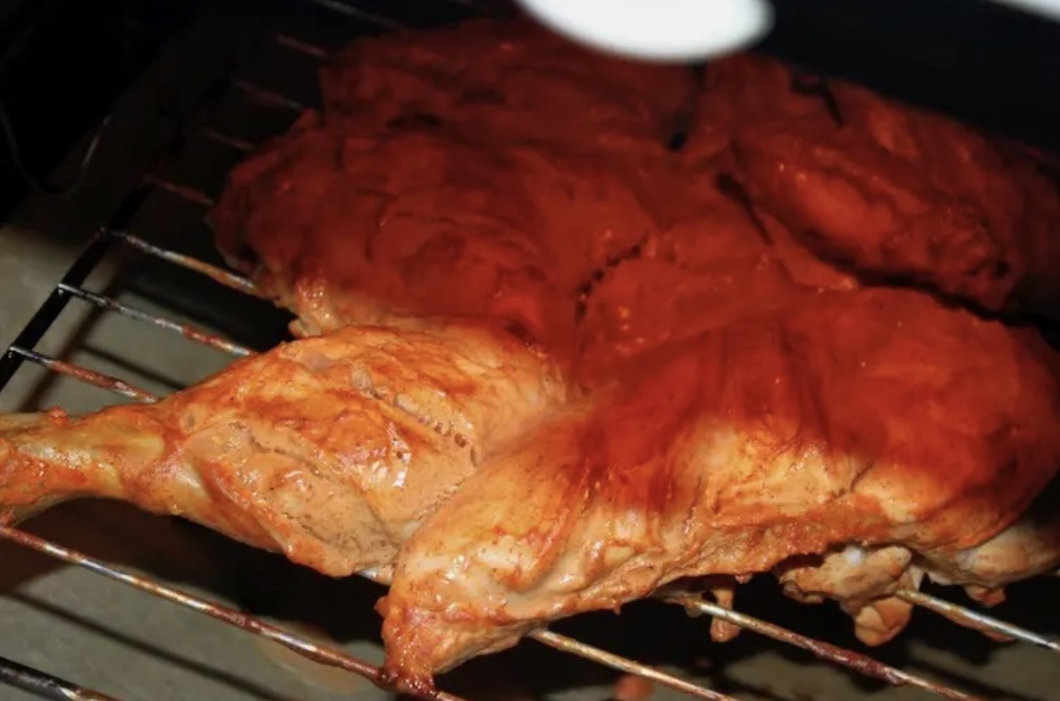 Połóż kurczaka na kratce grillowej na środkowym poziomie. Pod spód (na niższy poziom) wsuń blachę wyłożoną papierem, aby zbierała kapiący tłuszcz i marynatę.