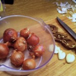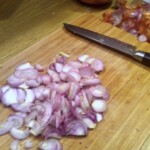 Posiekaj grzyby i czosnek. Szalotki obierz i posiekaj w piórka.