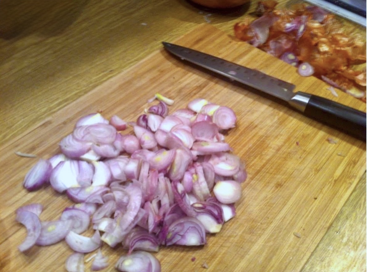 Posiekaj grzyby i czosnek. Szalotki obierz i posiekaj w piórka.