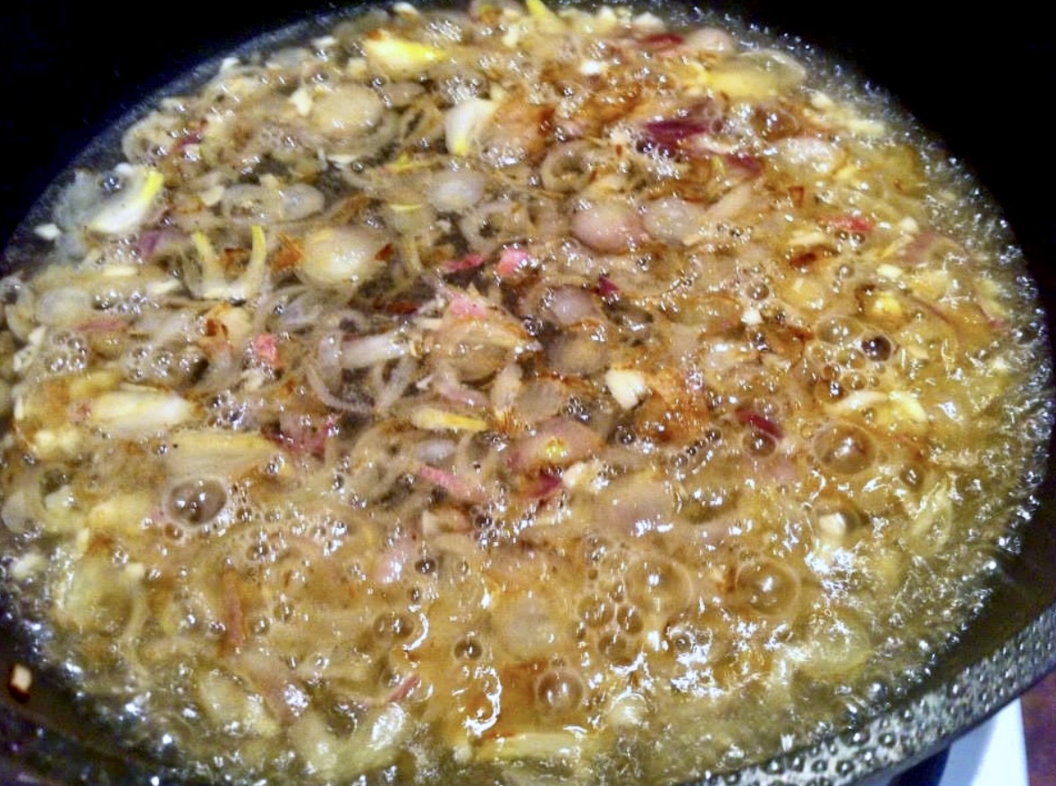 Na patelnię, na której smażył się kurczak, włóż nieco masła i wrzuć szalotkę. Smaż chwilę, aż się zeszkli.