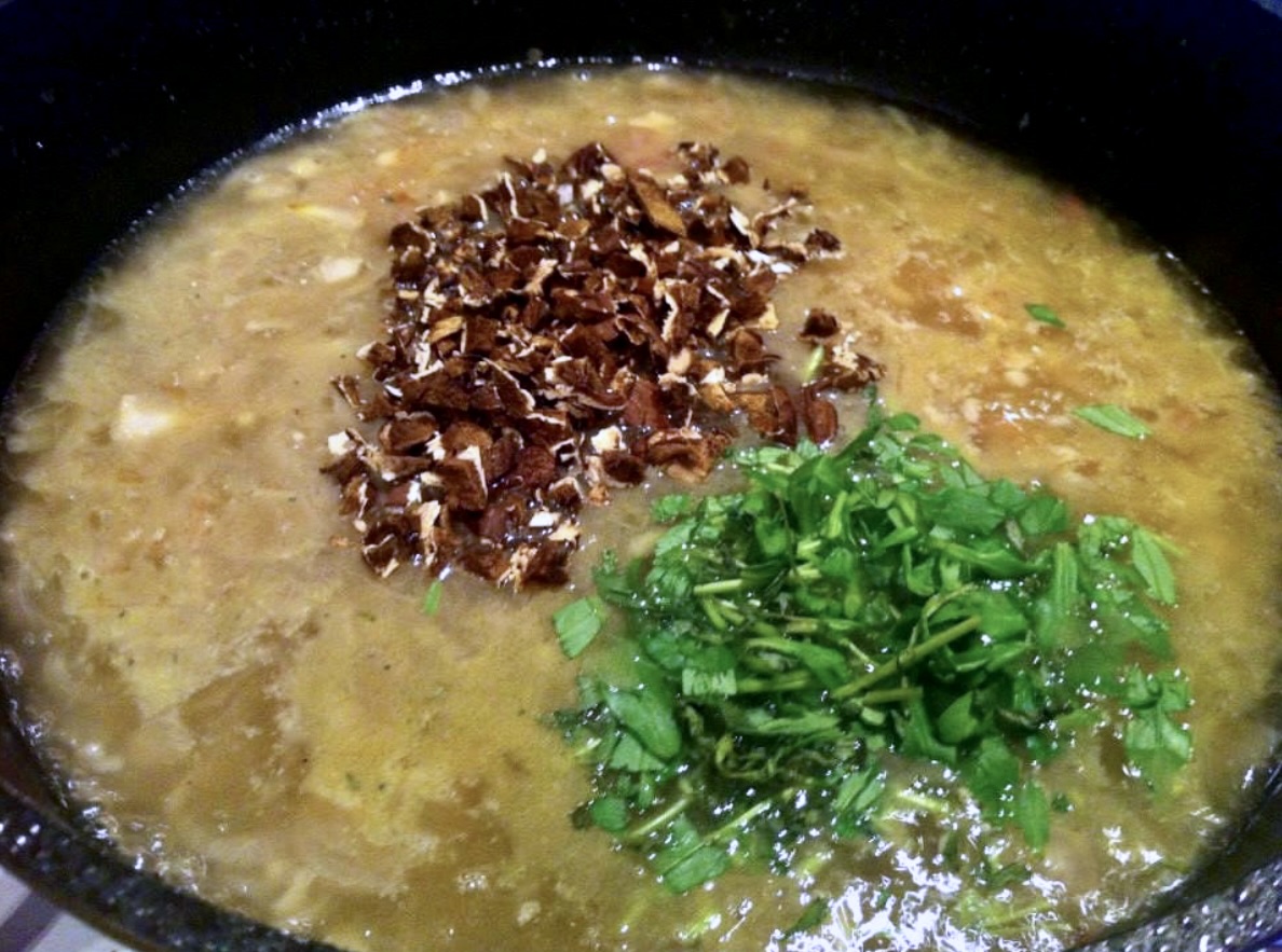 Wlej na patelnię 400 ml bulionu drobiowego, wrzuć posiekaną garść świeżego estragonu i grzyby.