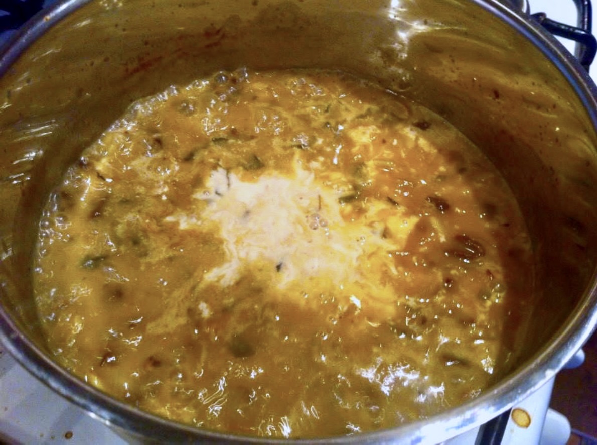 Gdy kurczak się rumieni, przelej zawartość naczynia żaroodpornego (sos) do garnka, a następnie wstaw na duży ogień.