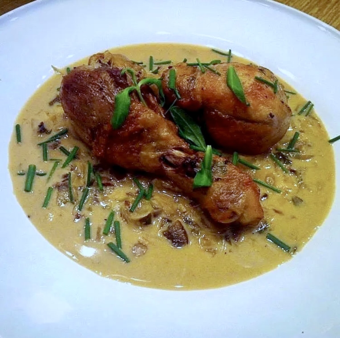 To danie to wytworna, ale nieskomplikowana potrawa, w której kurczak jest duszony w alzackim winie Riesling z dodatkiem świeżego estragonu i suszonych grzybów.