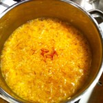 Postaw ryż na palniku, posól i gotuj. Gdy woda się zagotuje, wsyp 1/2 łyżeczki mielonej kurkumy (możesz dodać też szczyptę szafranu).
