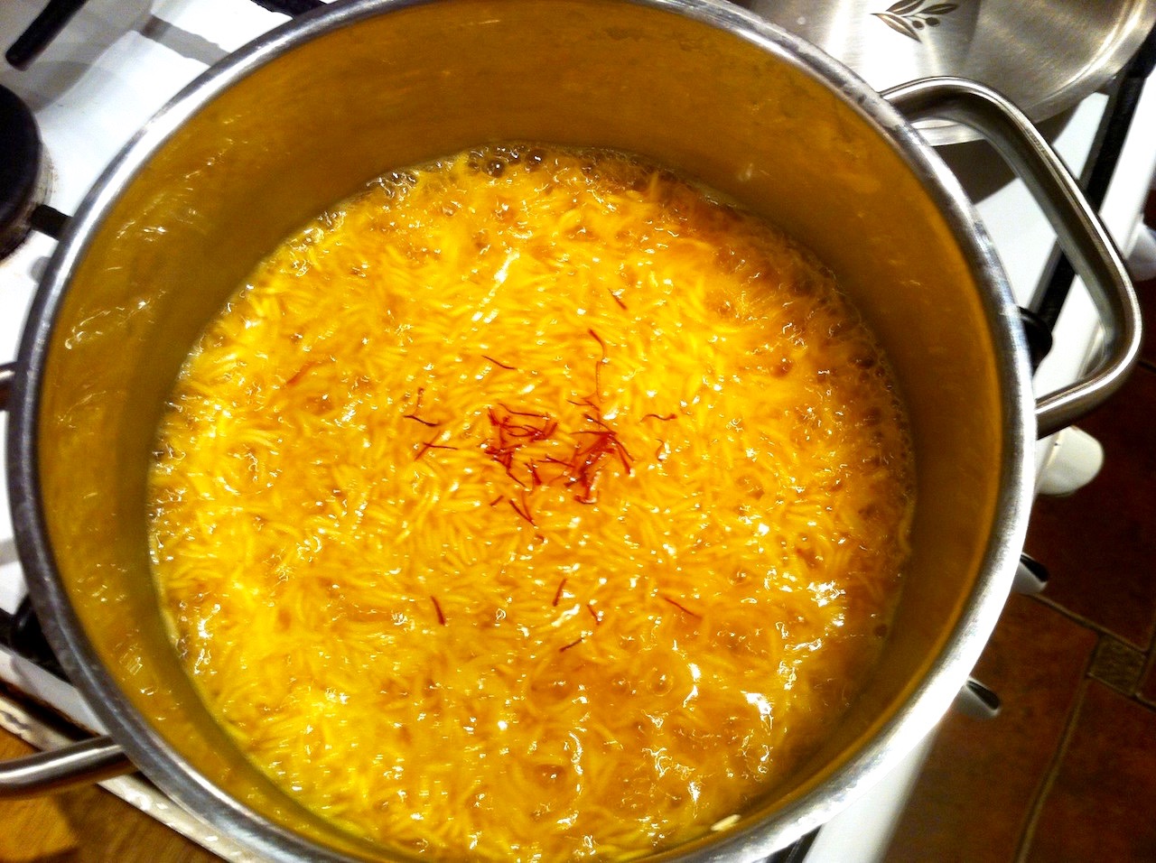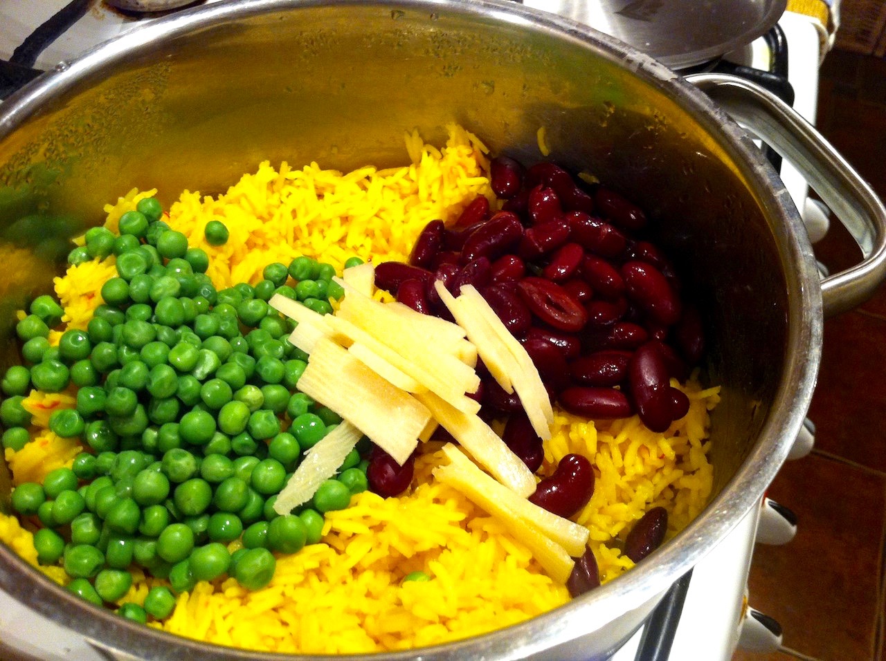 Postaw ryż na palniku, posól i gotuj. Gdy woda się zagotuje, wsyp 1/2 łyżeczki mielonej kurkumy (możesz dodać też szczyptę szafranu).
