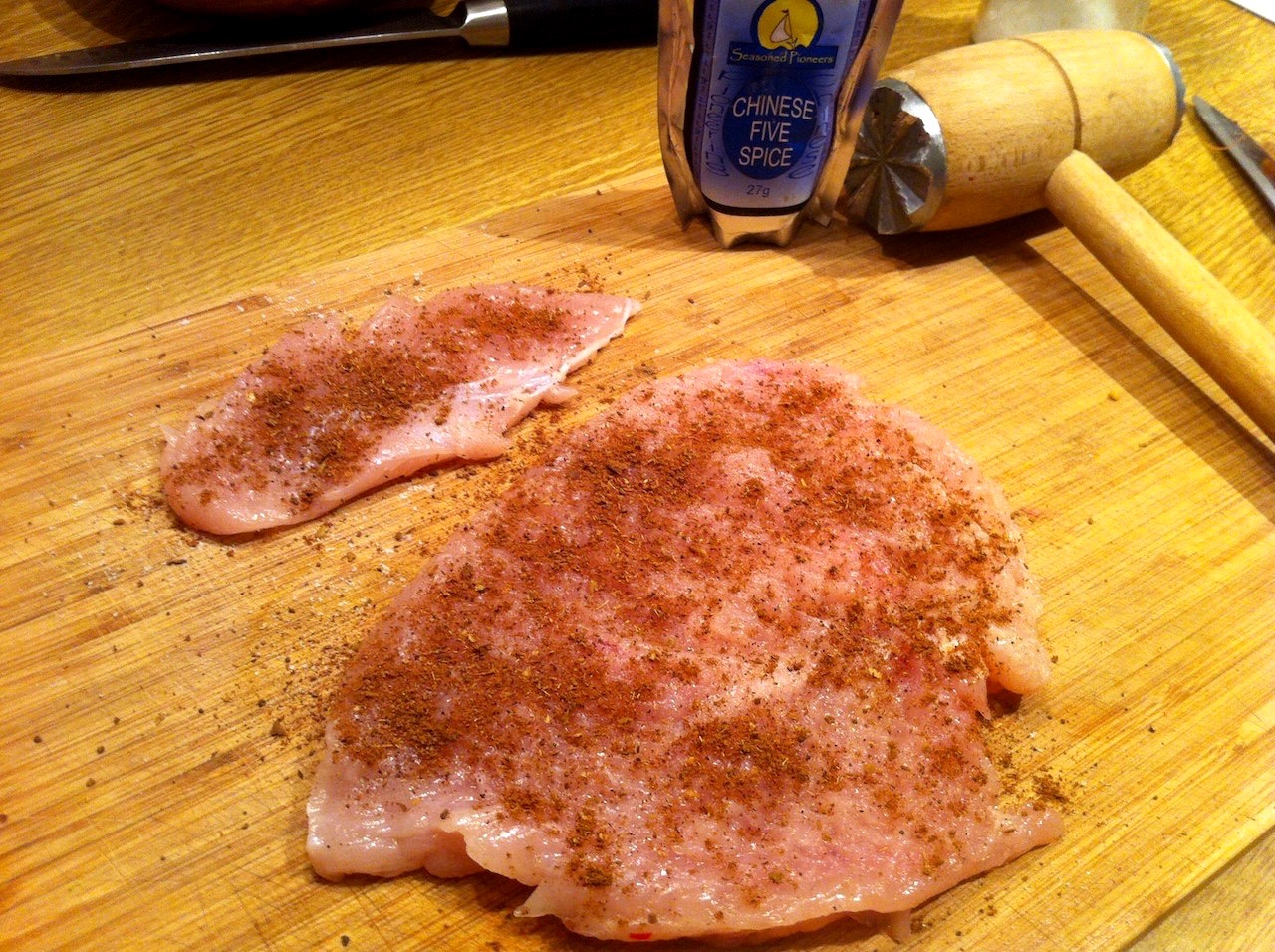 Oprósz solą, pieprzem i posyp sporą ilością przyprawy „chińskie pięć smaków”.
