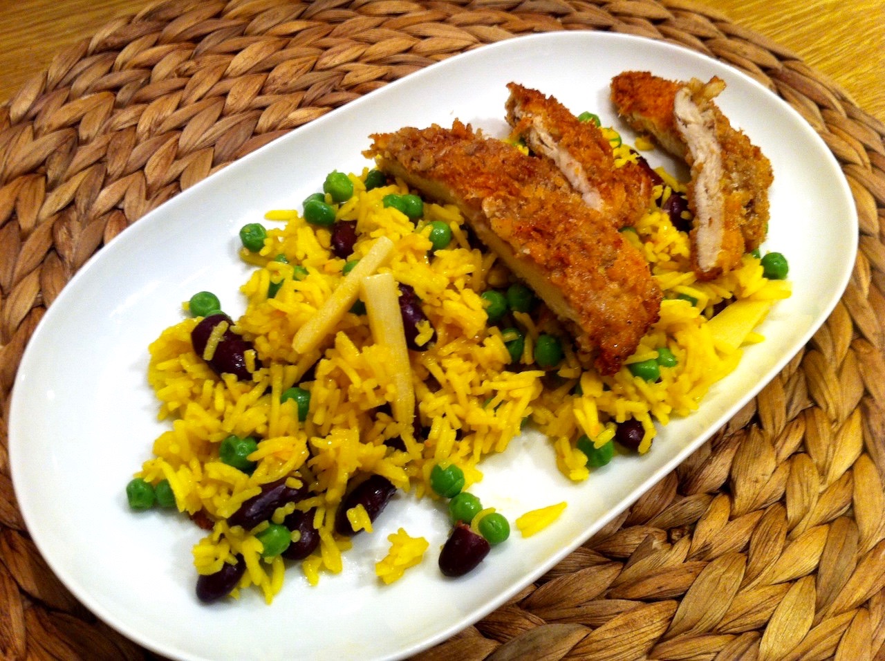 Podawaj kotleta pokrojonego w paseczki z kolorowym ryżem z warzywami.