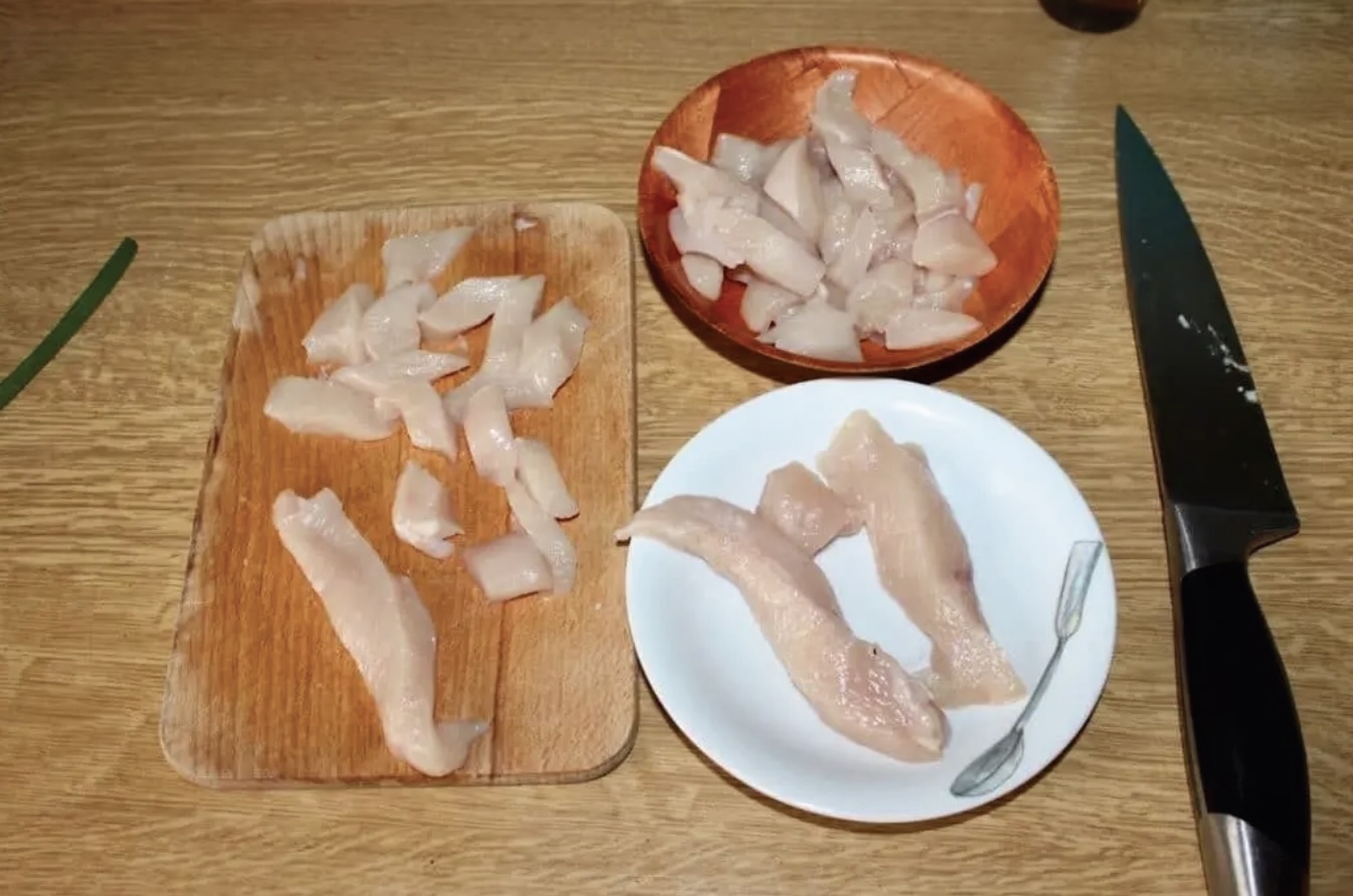 Kurczaka umyj i osusz, a następnie pokrój w cienkie paseczki.