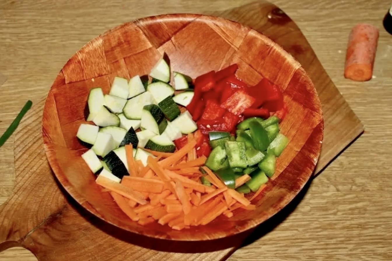 Warzywa umyj i pokrój – marchewka w julienne (zapałki), papryki w kostkę, a cukinia w różnego kształtu kawałki.