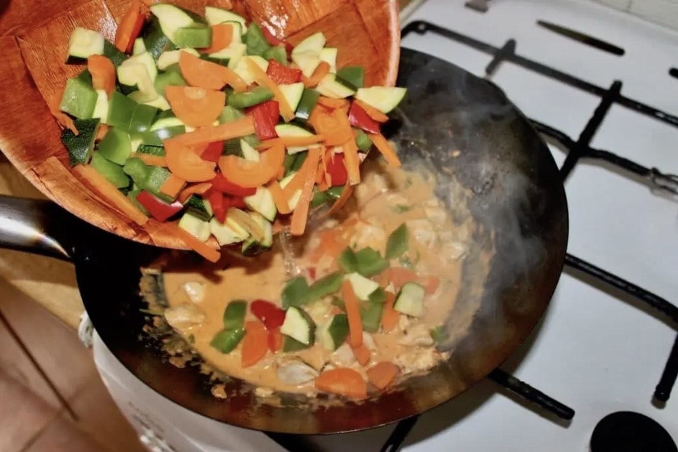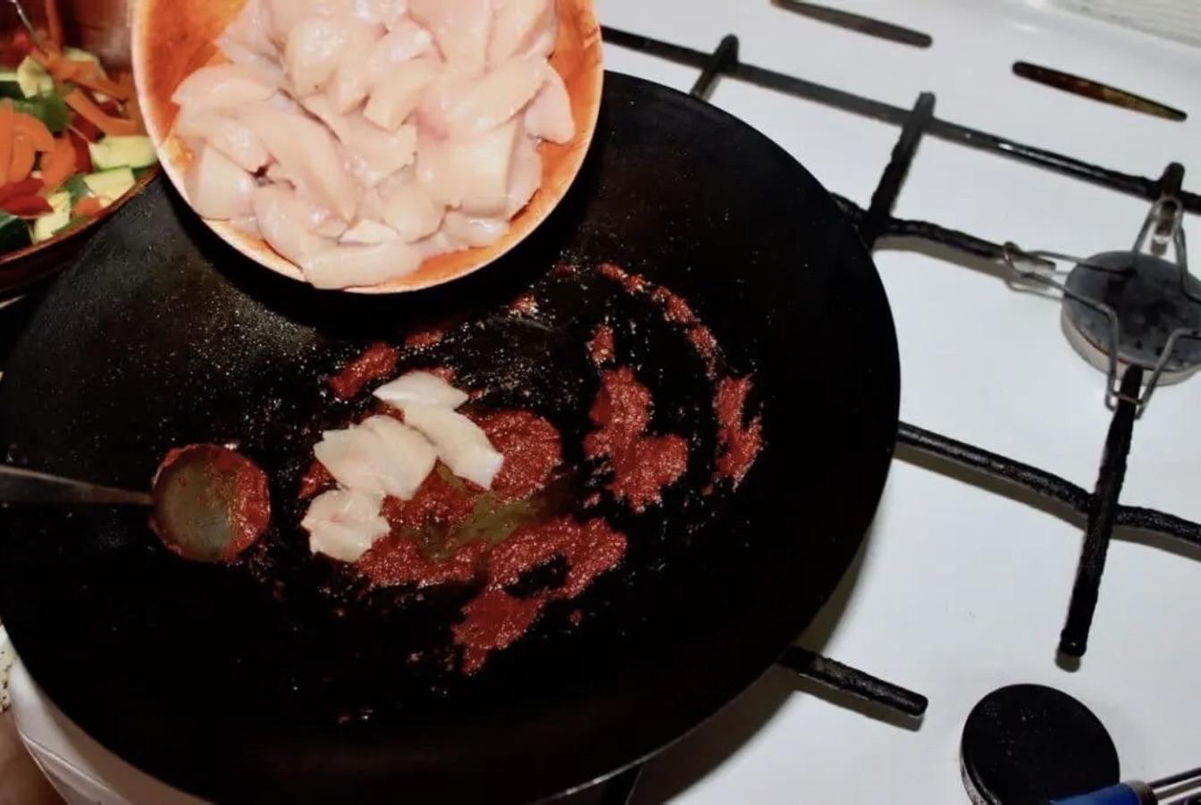 Podkręć gaz do maksimum i wrzuć kurczaka. Dokładnie go wymieszaj z pastą i smaż około 3 minut.