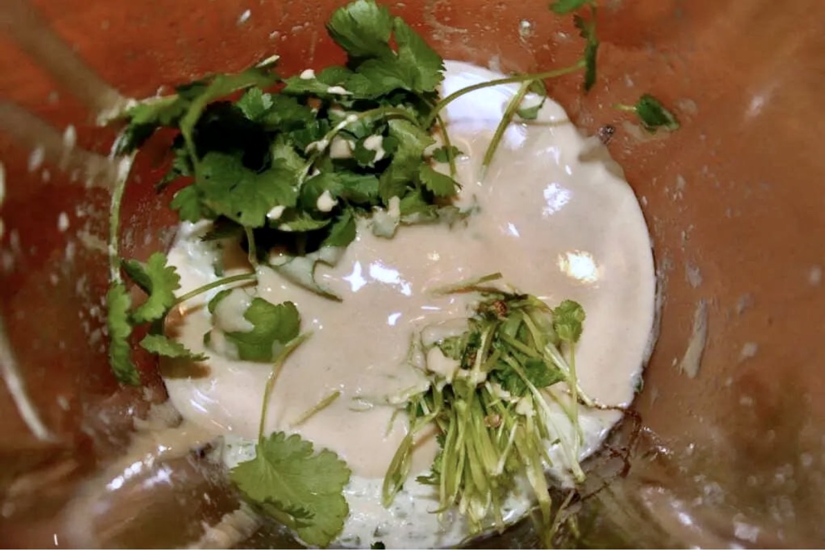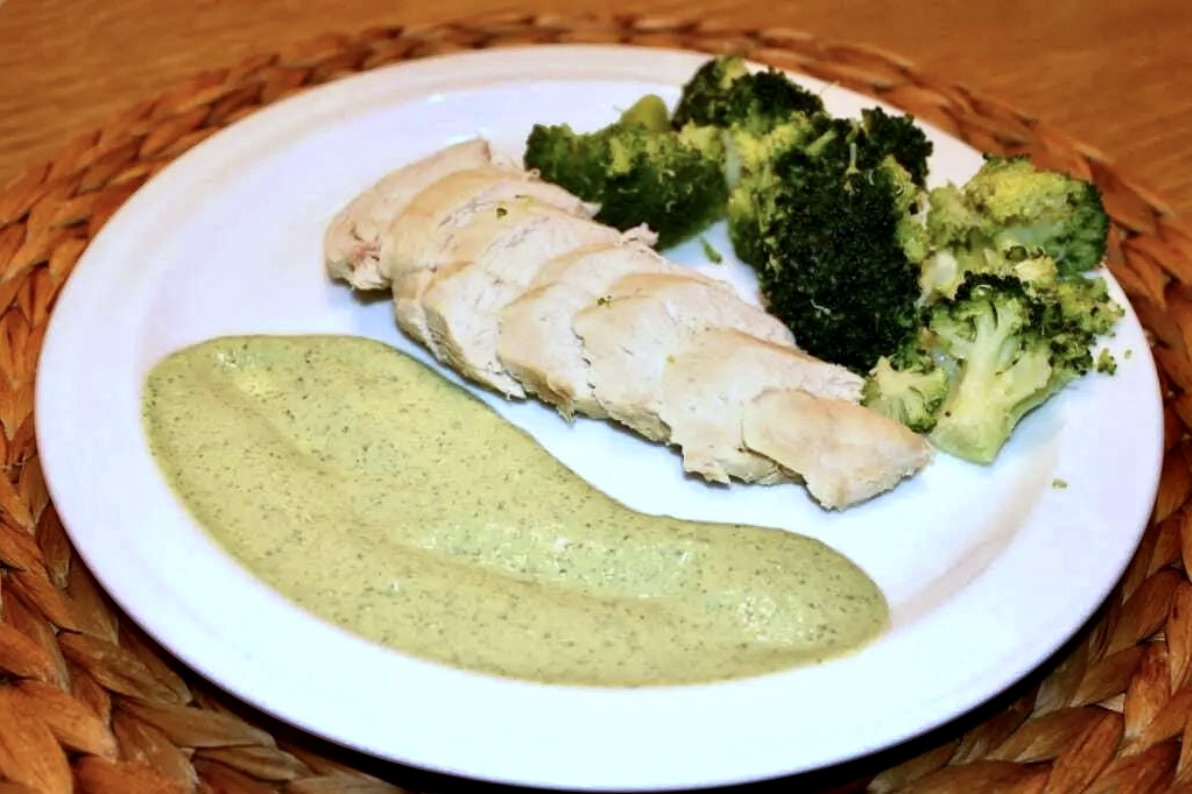 sok wyciśnięty z cytryny i szczyptę soli. Dolej odrobinę gorącego wywaru z gotowania kurczaka, aby uzyskać odpowiednią, dość gęstą konsystencję, i zmiksuj całość na gładką masę.
