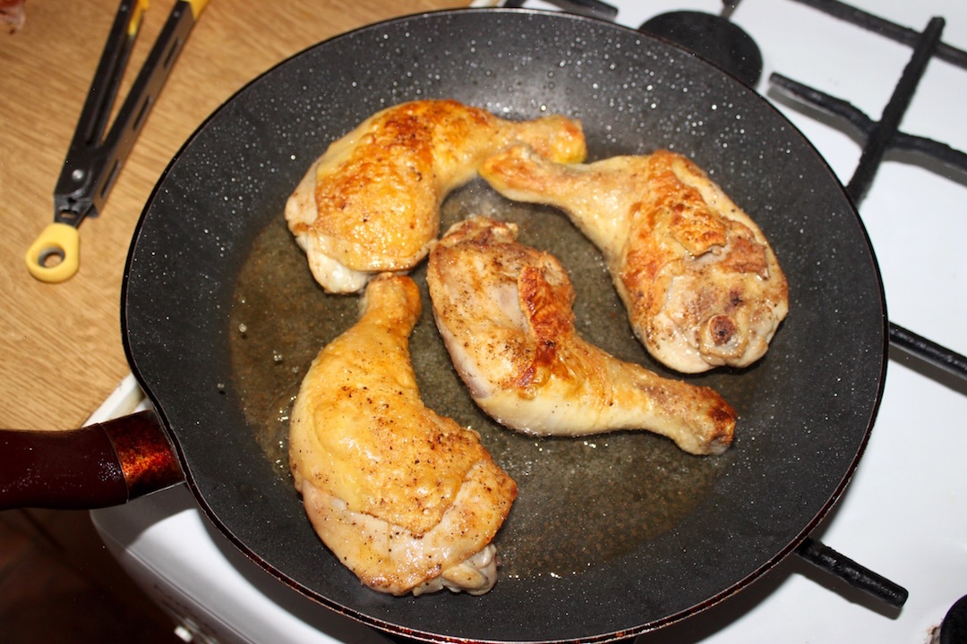 Obsmaż udka na patelni z niewielką ilością oleju na mocnym ogniu, aż się zrumienią z obu stron.