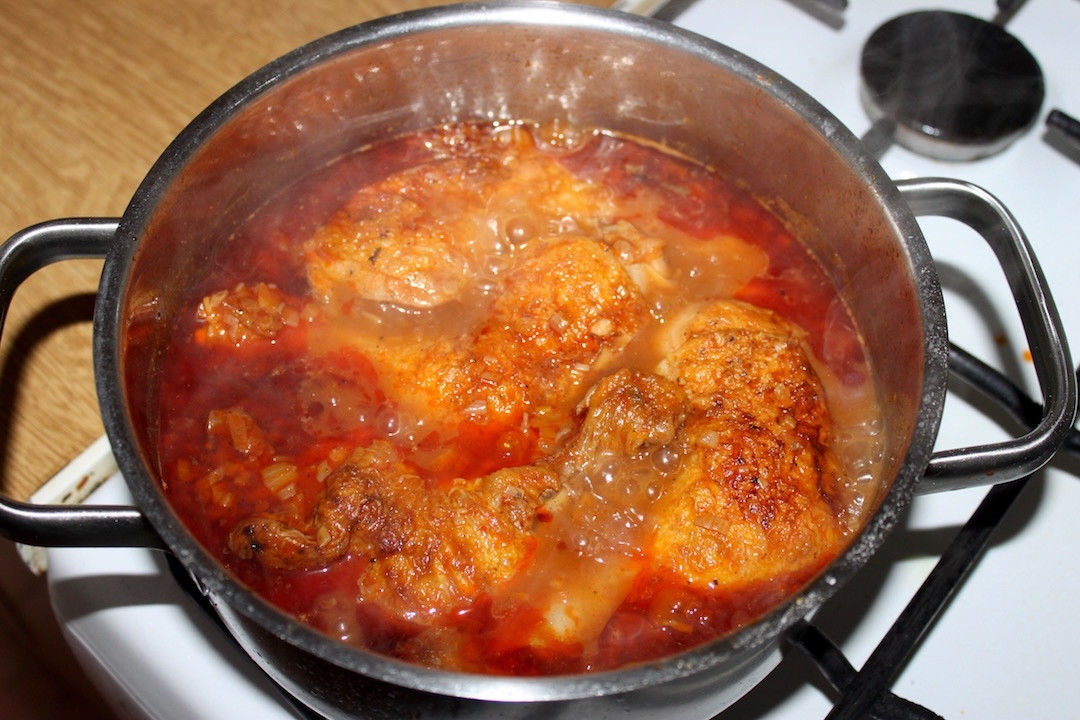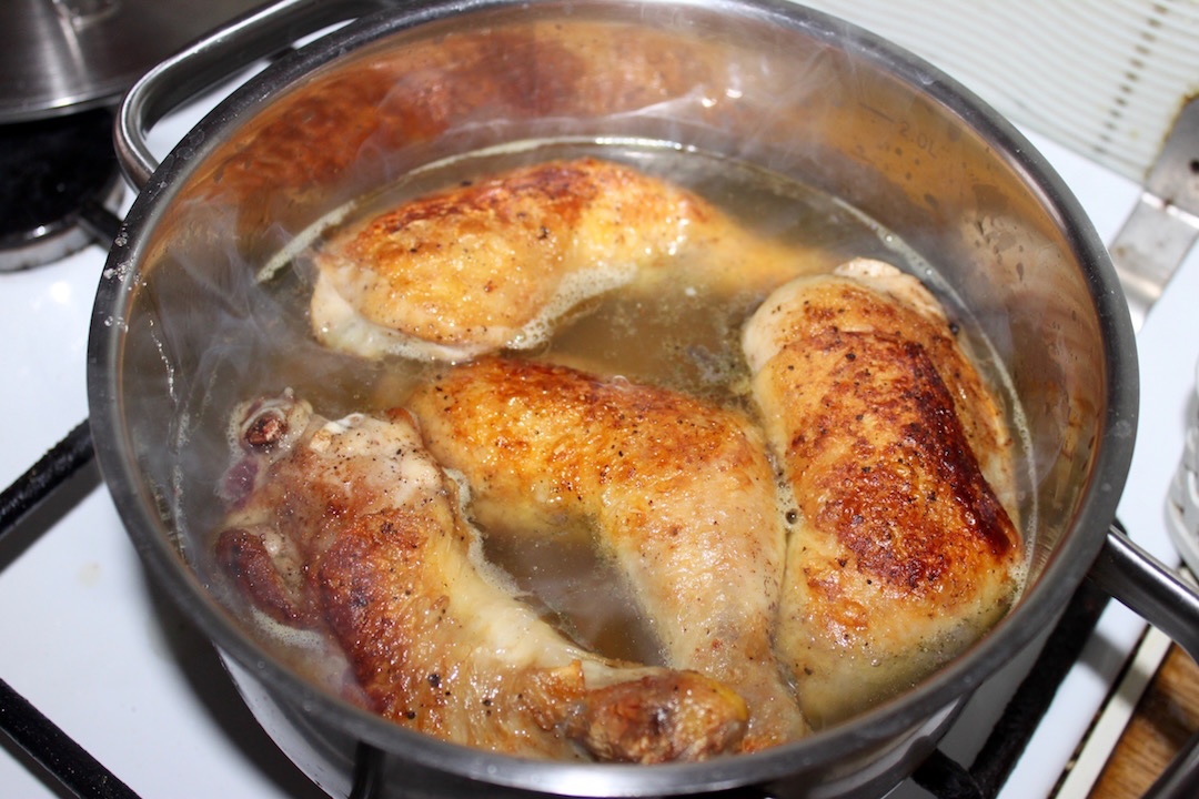 Przykryj garnek i duś kurczaka na małym ogniu przez około godzinę, aż mięso będzie zupełnie miękkie.
