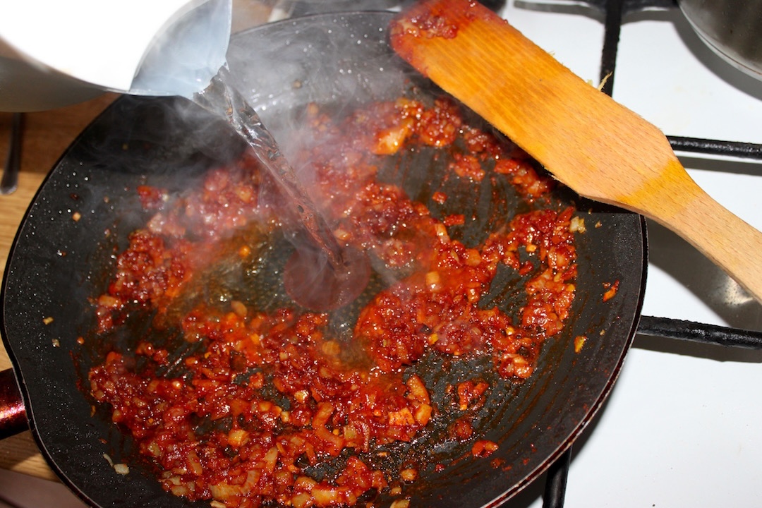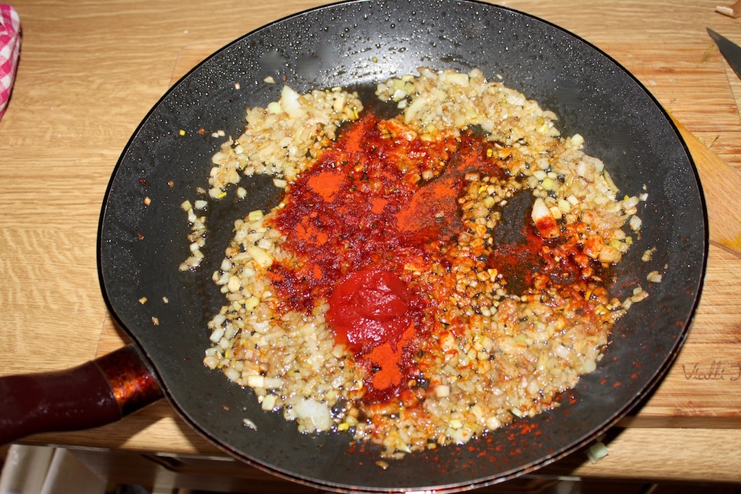 Zdejmij patelnię z ognia, wsyp 2 łyżki słodkiej papryki oraz 1 łyżeczkę ostrej. Wymieszaj, aby powstała pasta (ważne, by nie przypalić papryki na ogniu, bo zgorzknieje).
