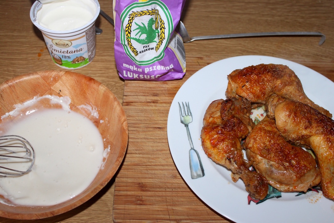 Do sosu: 1-2 łyżki gęstej kwaśnej śmietany, 1 łyżeczka mąki pszennej, koncentrat pomidorowy (opcjonalnie do smaku).