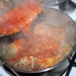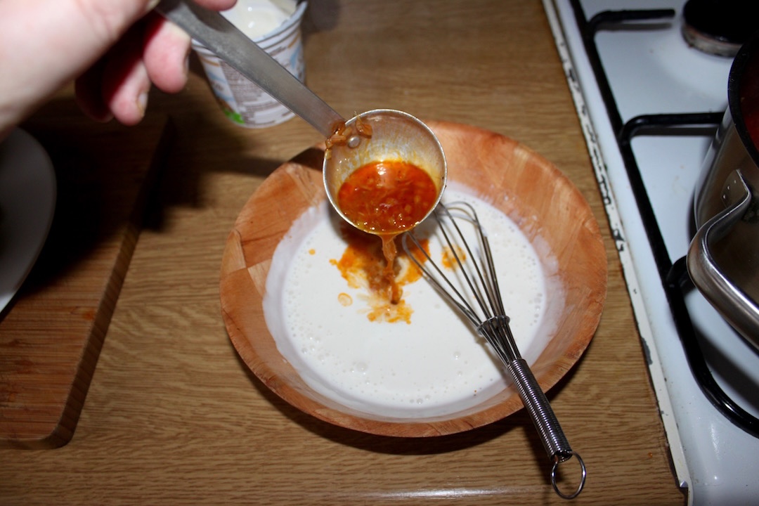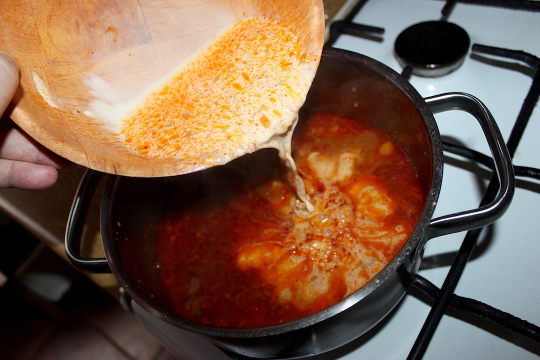 Zahartuj mieszankę, dolewając do niej 2 chochle gorącego sosu z garnka, wymieszaj i wlej całość z powrotem do garnka. Zagotuj.