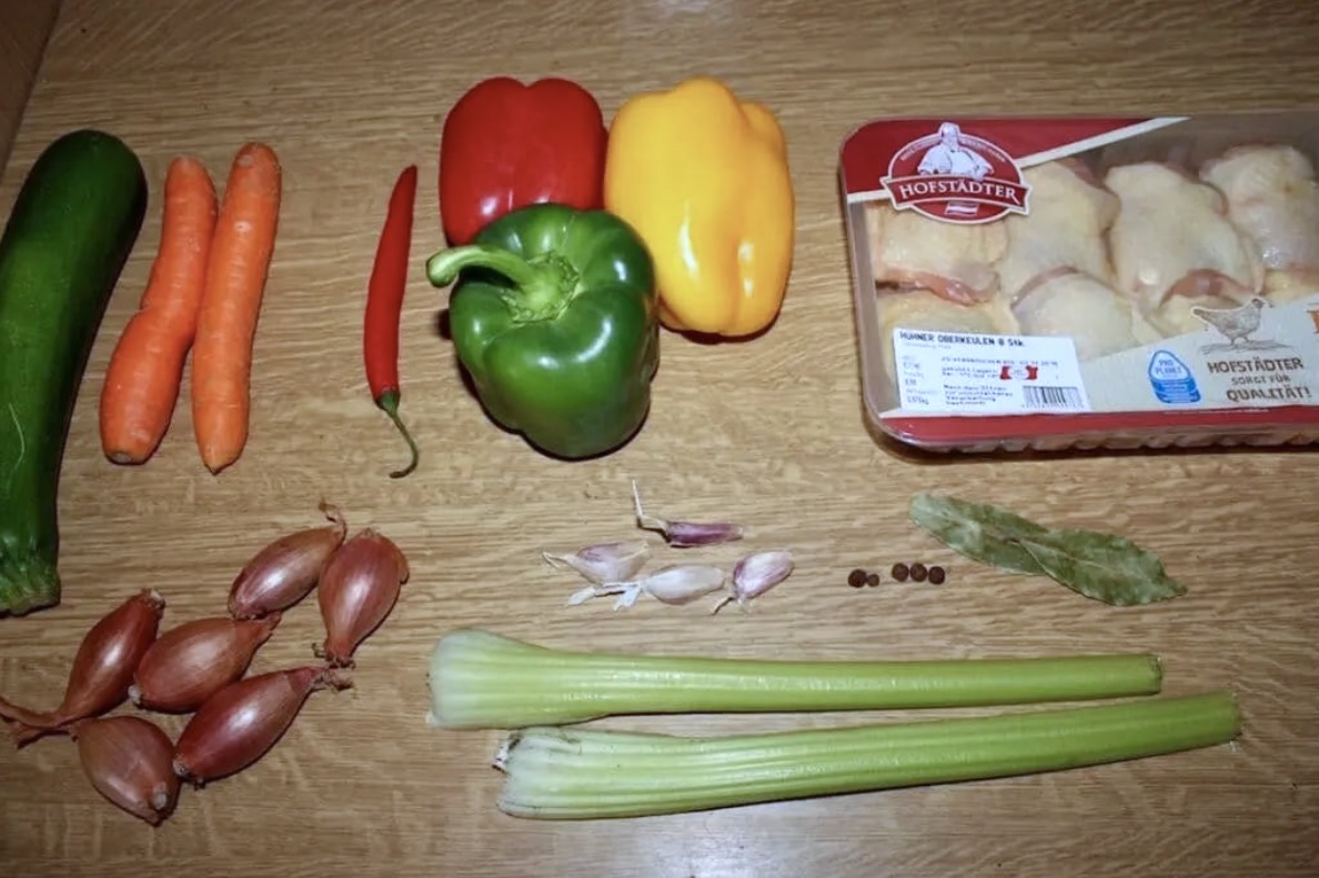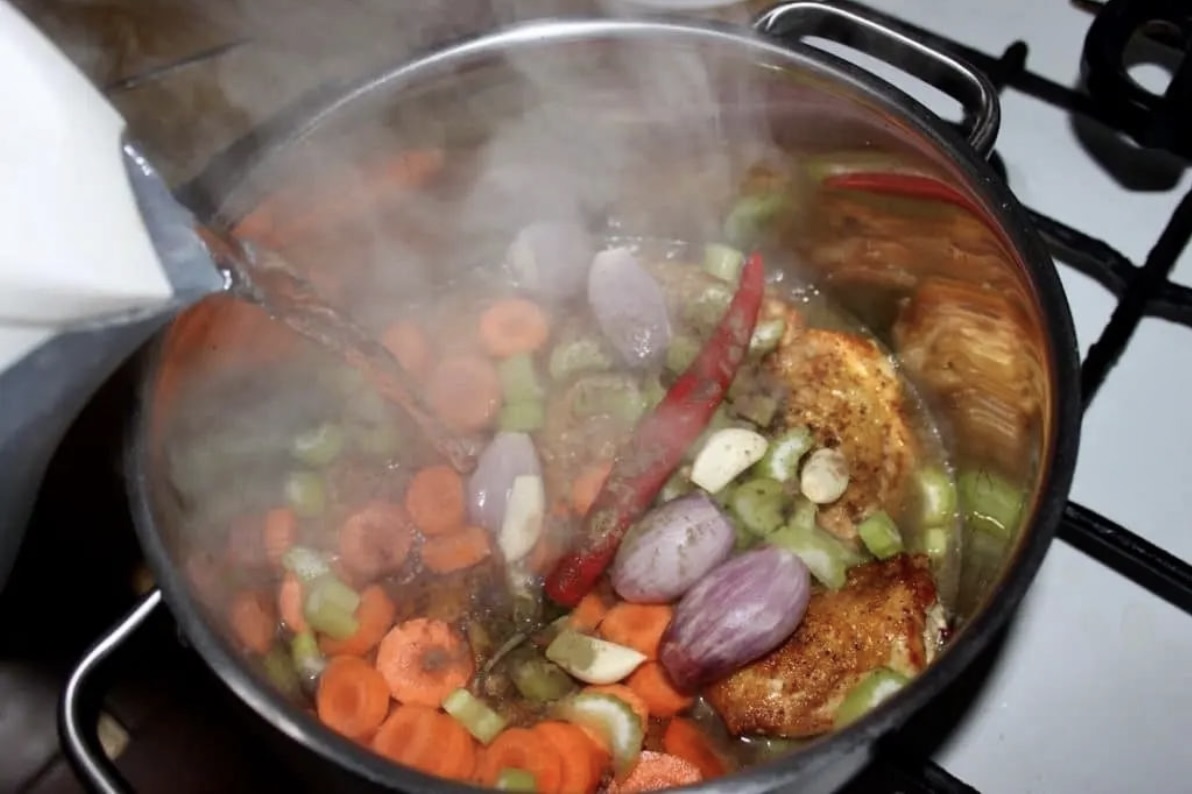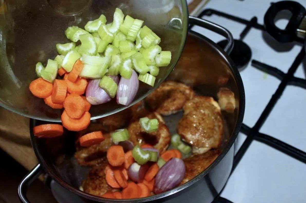 Podsmażonego kurczaka przełóż do dużego garnka. Dodaj marchewkę, seler, szalotki, czosnek, liście laurowe, ziele angielskie oraz całą papryczkę chilli.