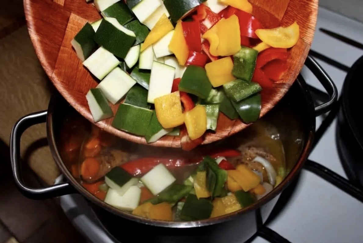 Do garnka wrzuć pokrojone papryki oraz cukinię.