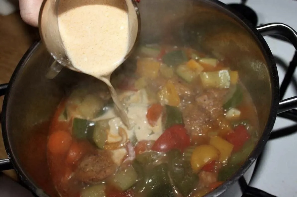 Wymieszaj i wlej do potrawy. Zagotuj przez 1 minutę. Na koniec sprawdź smak i ewentualnie dopraw solą i pieprzem.